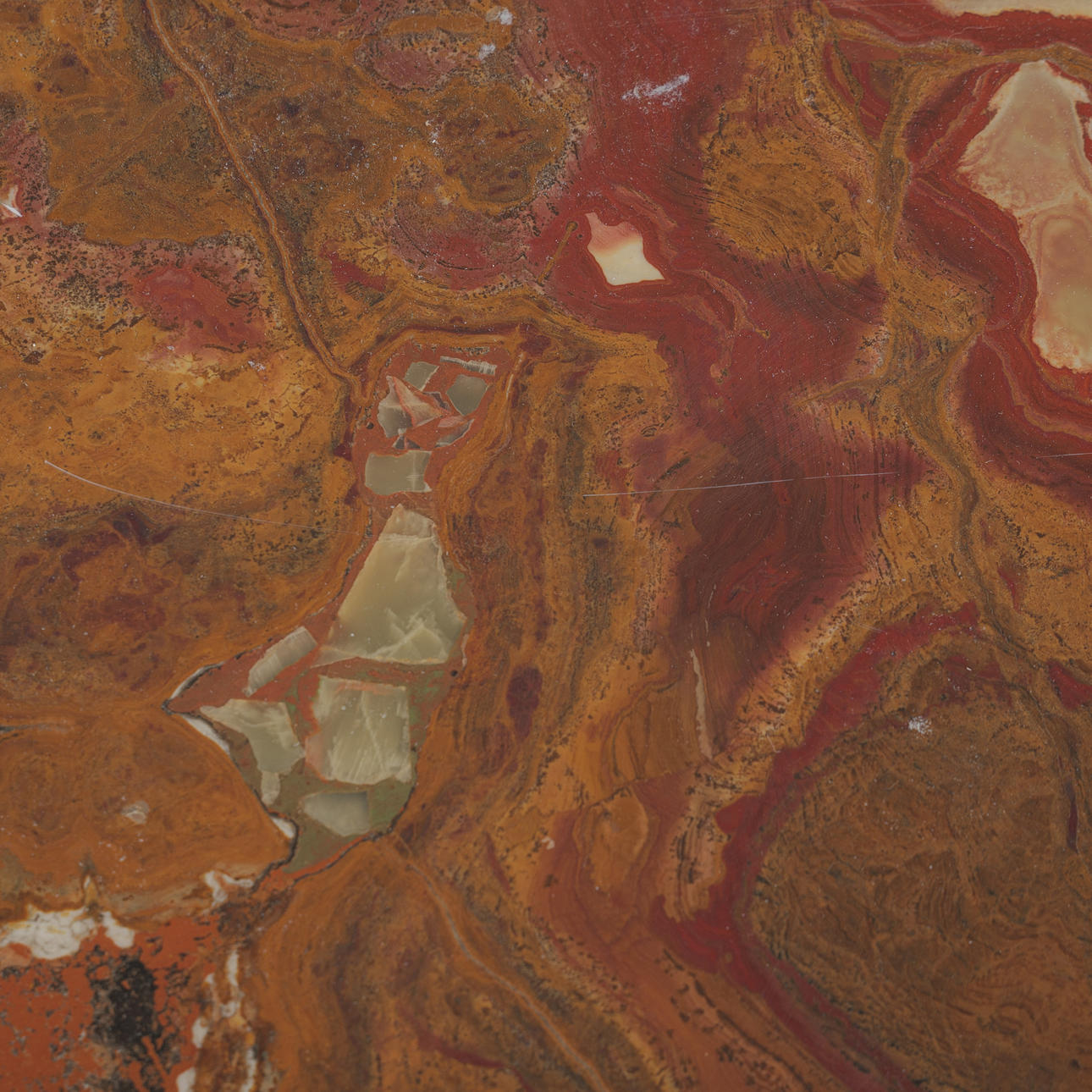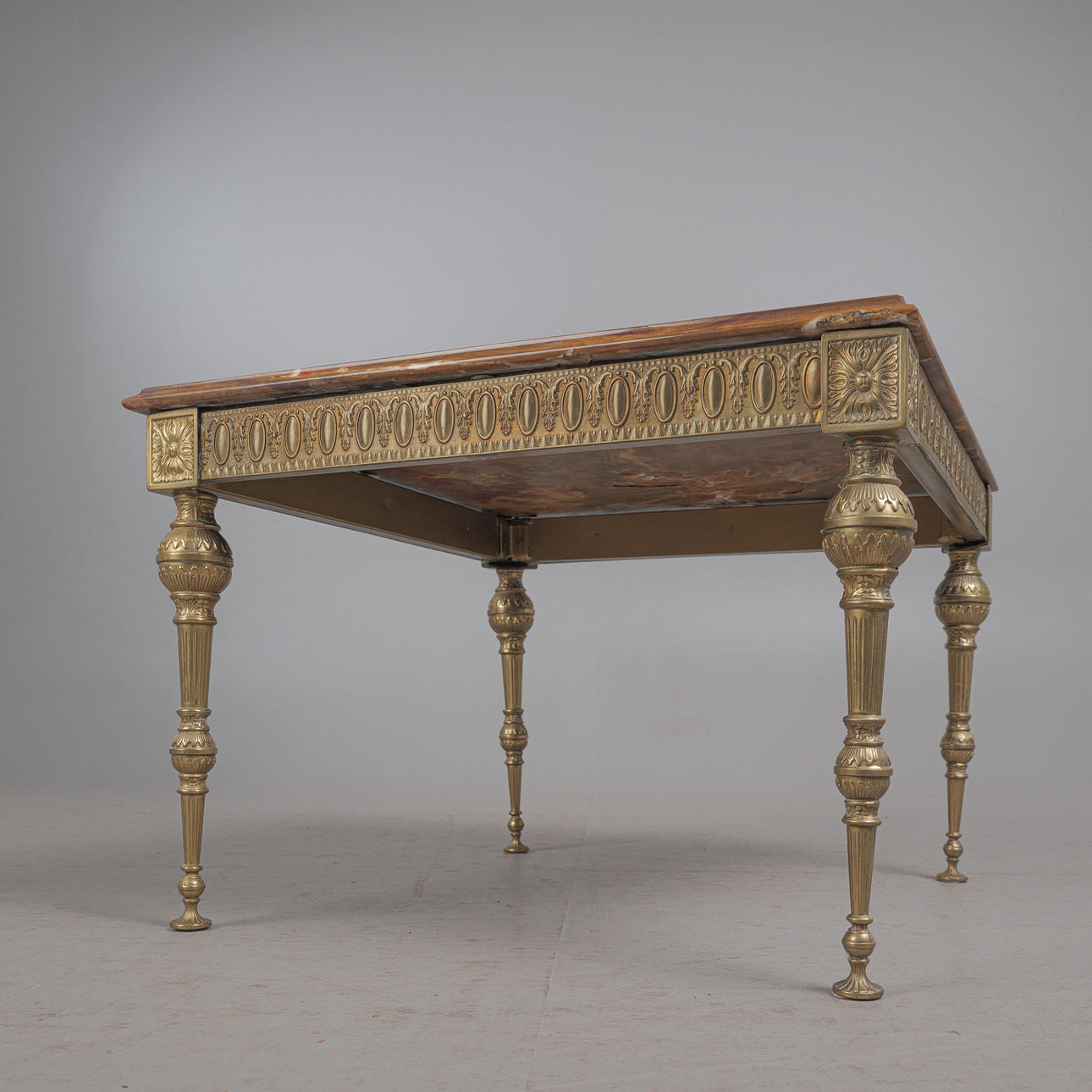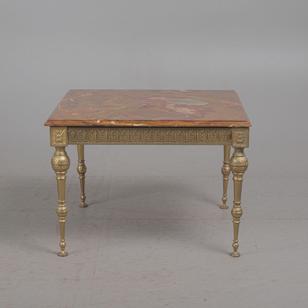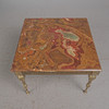 Marmorbord / sidebord, messing, marmor, 1970'erne. Design med en firbenet messingbund med dekorative dekorationer og en løst placeret, firkantet bordplade lavet af rød-brun master marmor med grønne accenter, H.48cm, L.70cm, B.70cm.