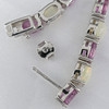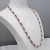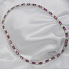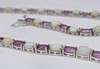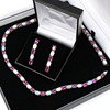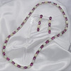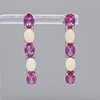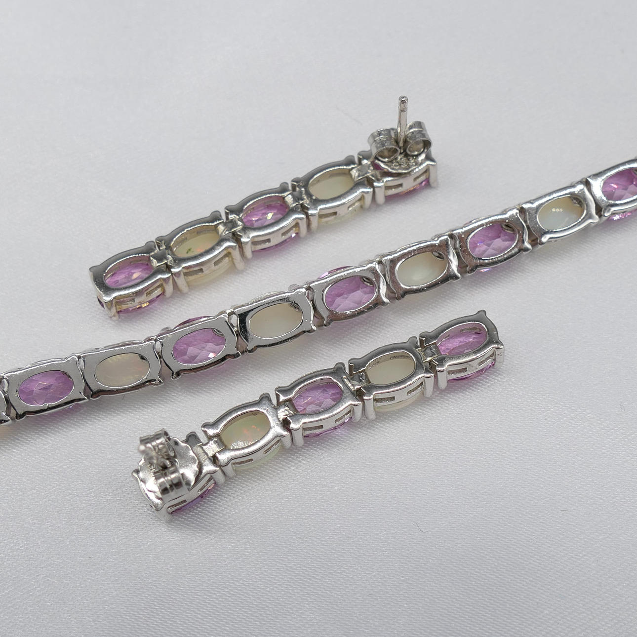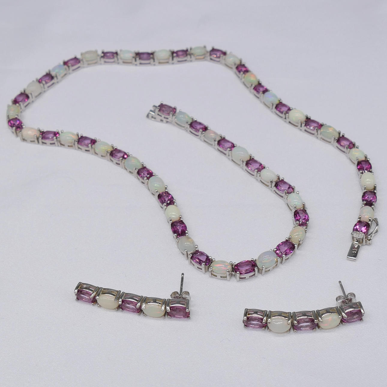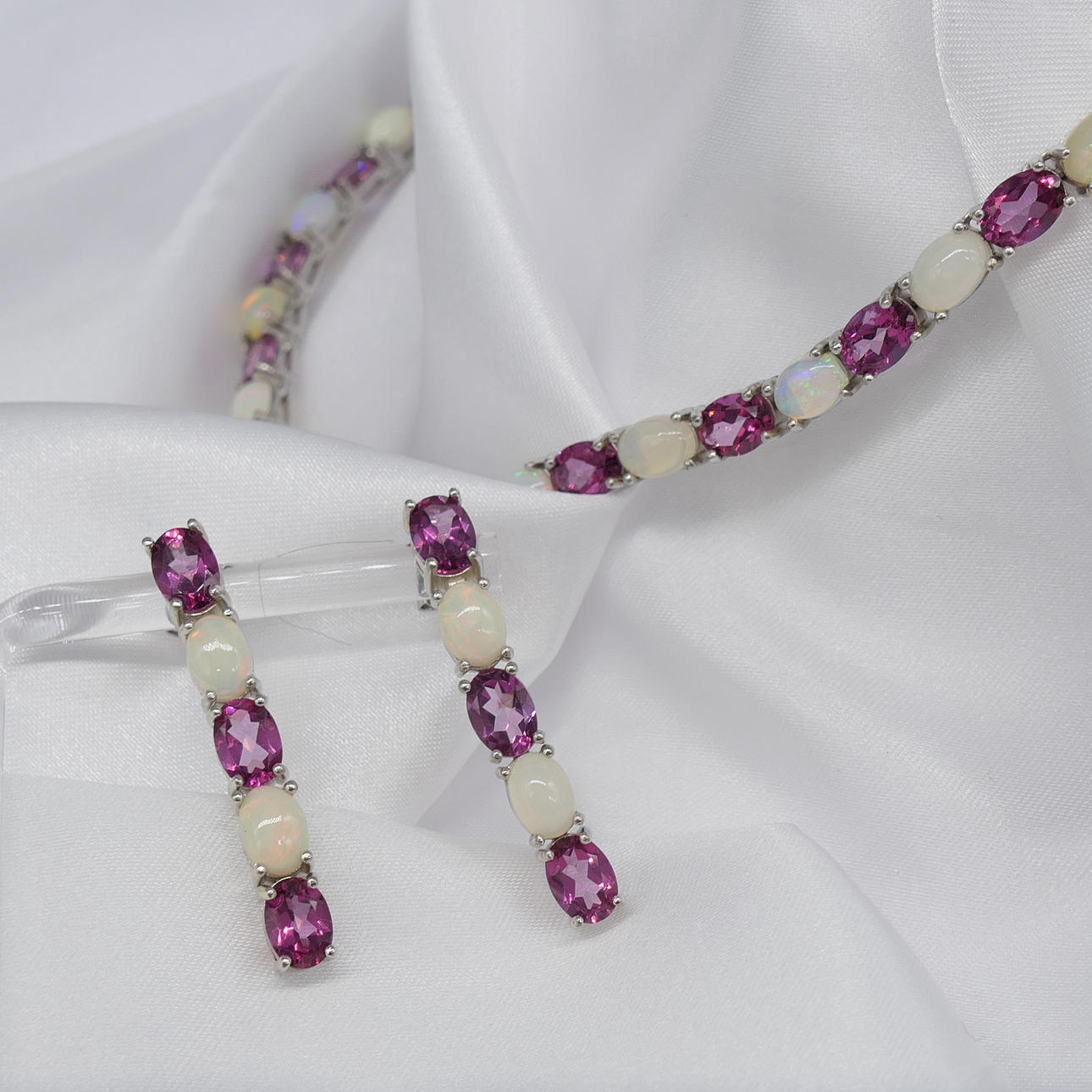 Et fantastisk matchende smykkesæt, bestående af en sølvhalskæde og et par øreringe skiftevis prydet med pink turmalin og naturlig hvid opal, i æske.