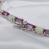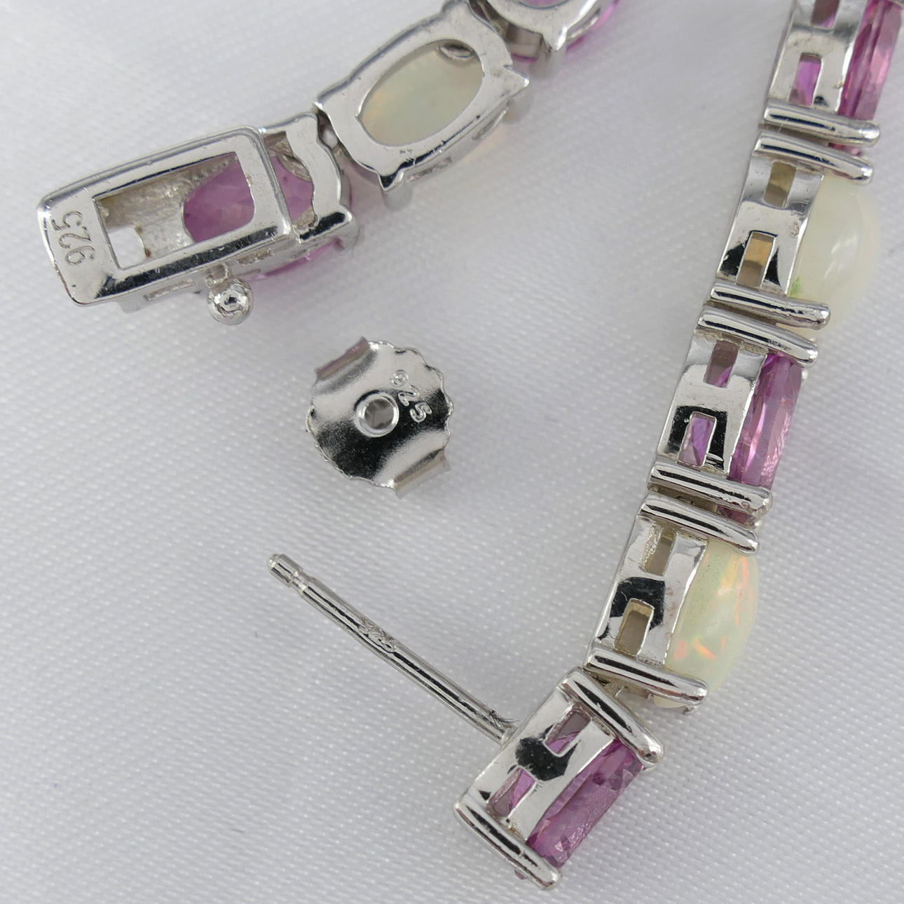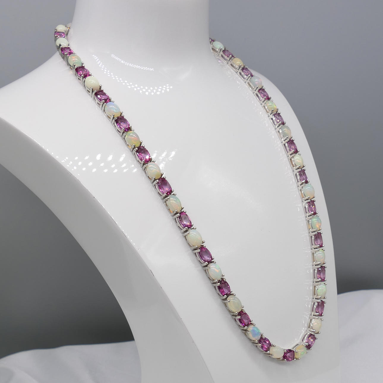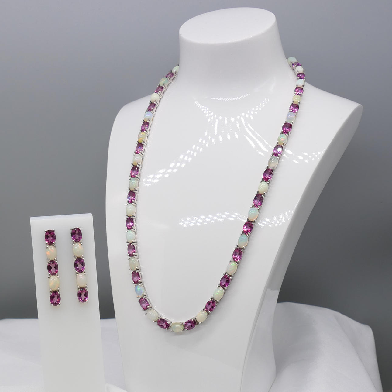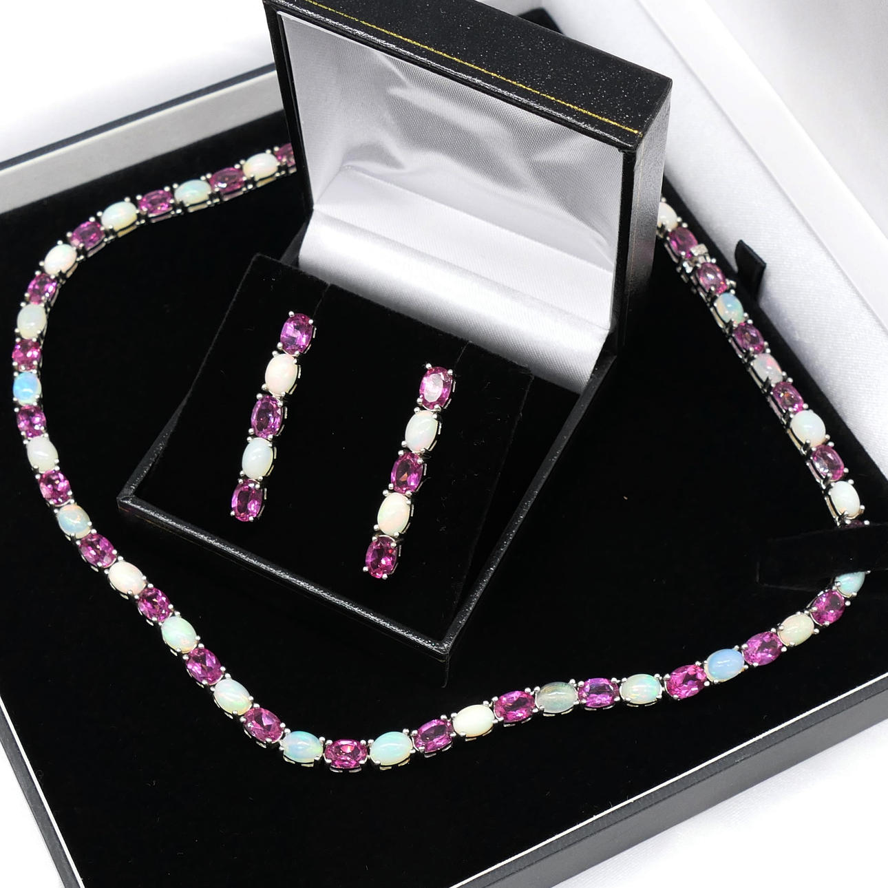 I alt 37 naturlige ovale turmalin og 34 ovale cabochon etiopiske hvide opaler er sat til dette smykkeparure.