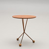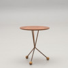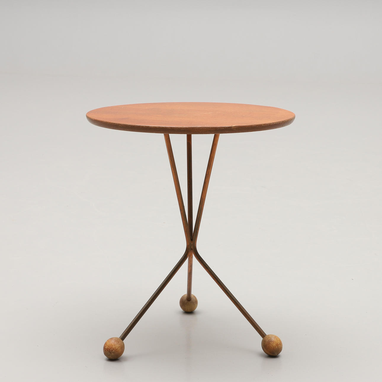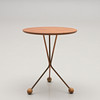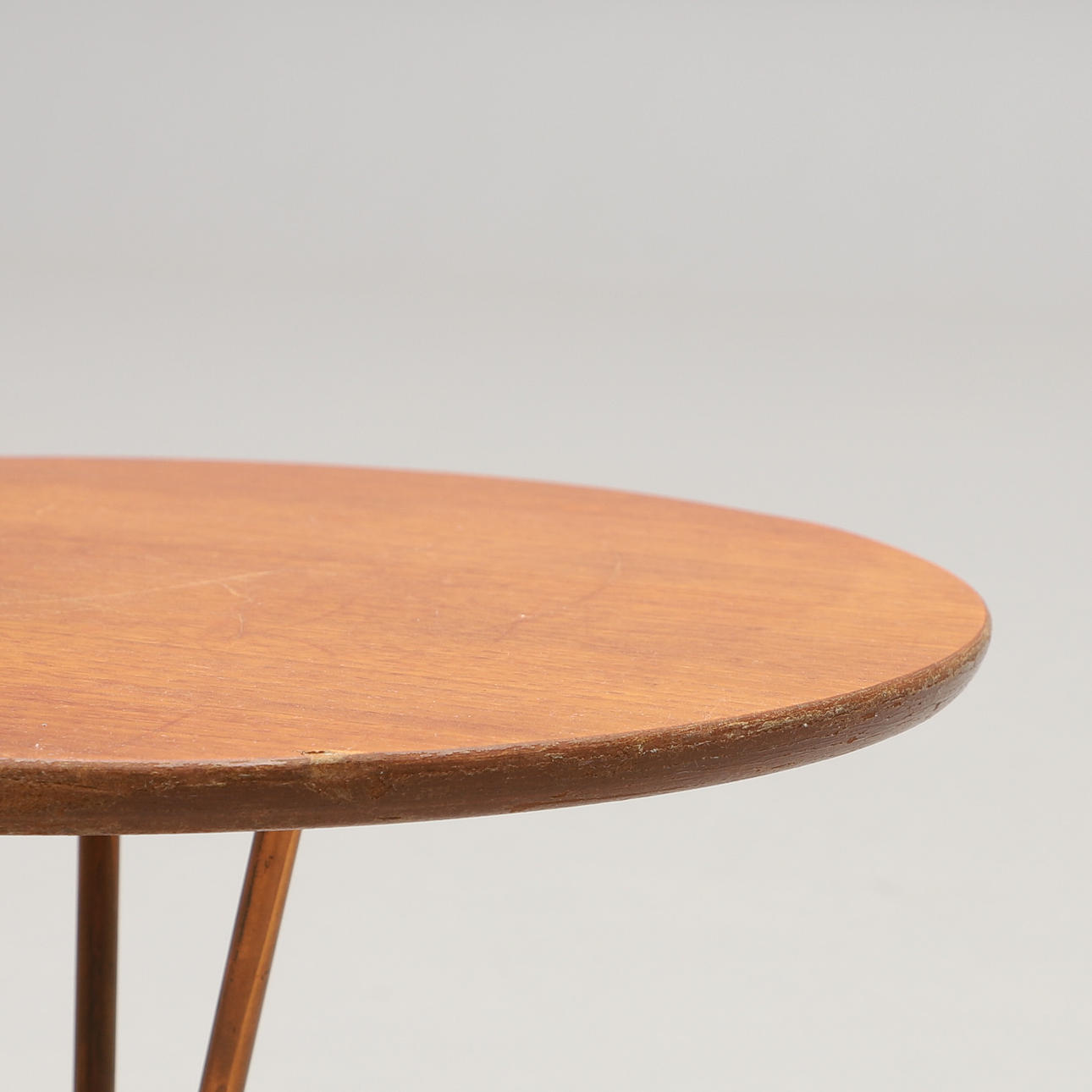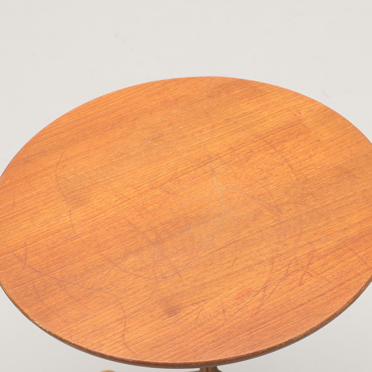 Også kaldet "Bord-på-en-dåse". Rundt bord i teaktræ på metalben. Klubfødder. Diam 39,5, højde 45,5 cm.