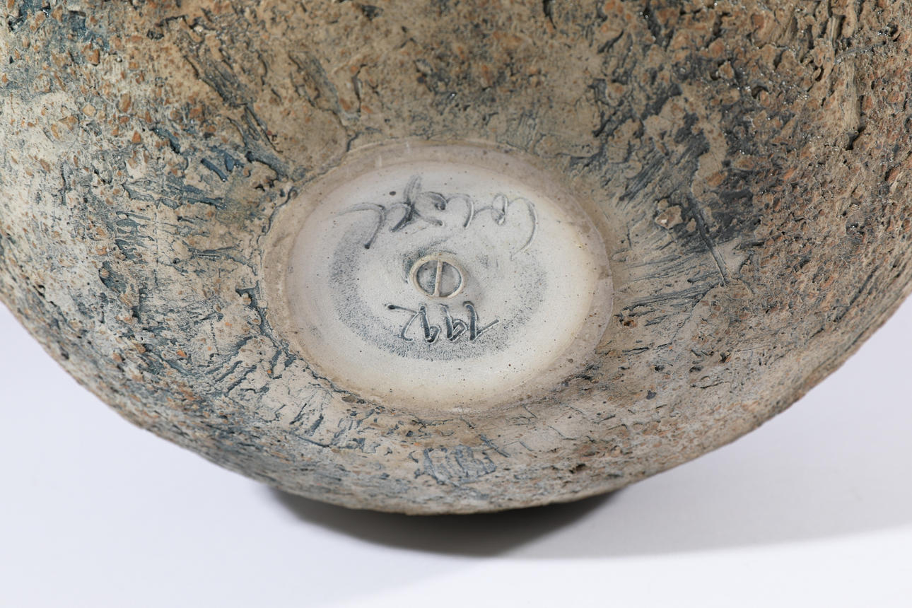 kuglevase. 1992 stentøj. Struktureret overflade, gråbrun glaseret. H. 24 cm, D. 29 cm. Med værkstedsmærke (stempel), signeret og dateret (ridset) i bunden.