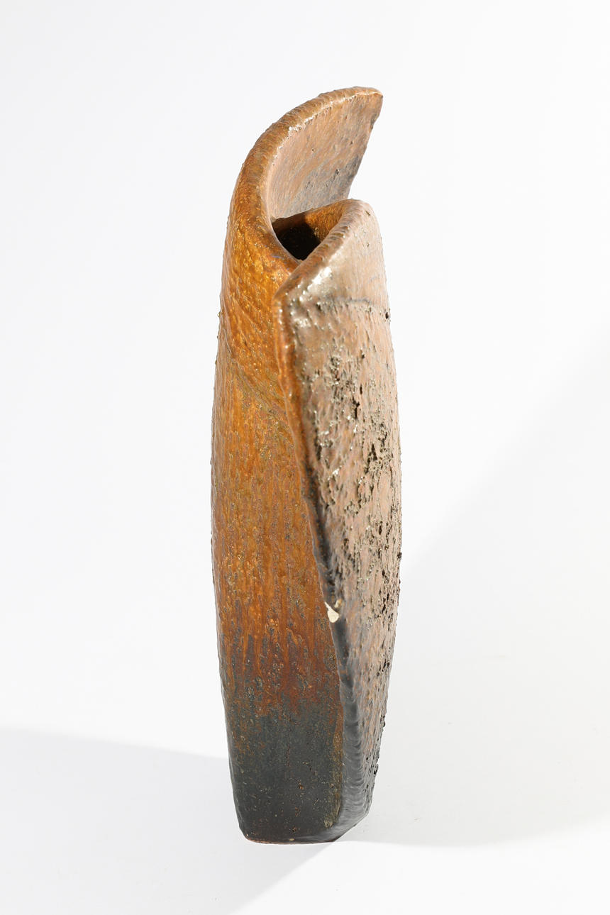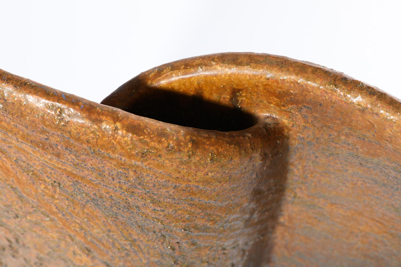 vinge vase. stentøj. Struktureret overflade glaseret brun-sort. H. 37 cm, D. 37 cm. Mærket i bunden med værkstedsmærke (præget stempel).