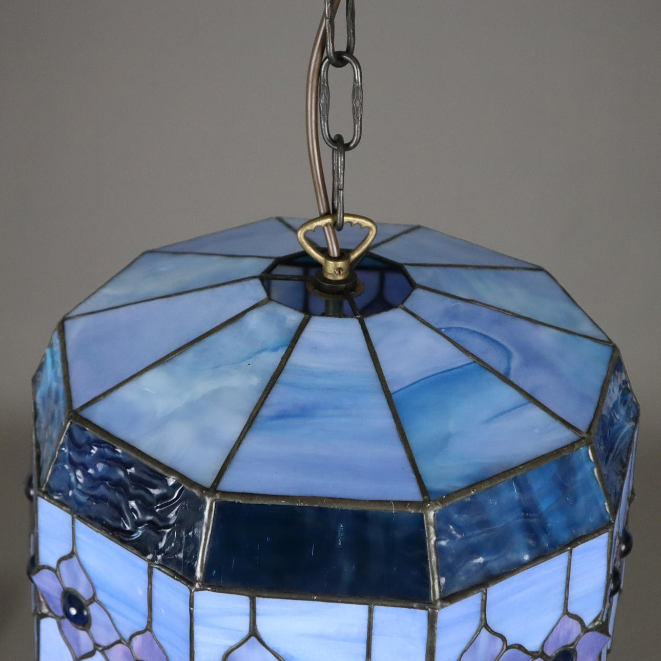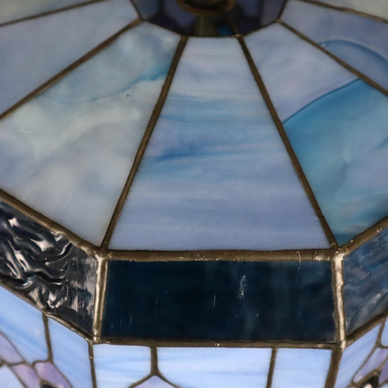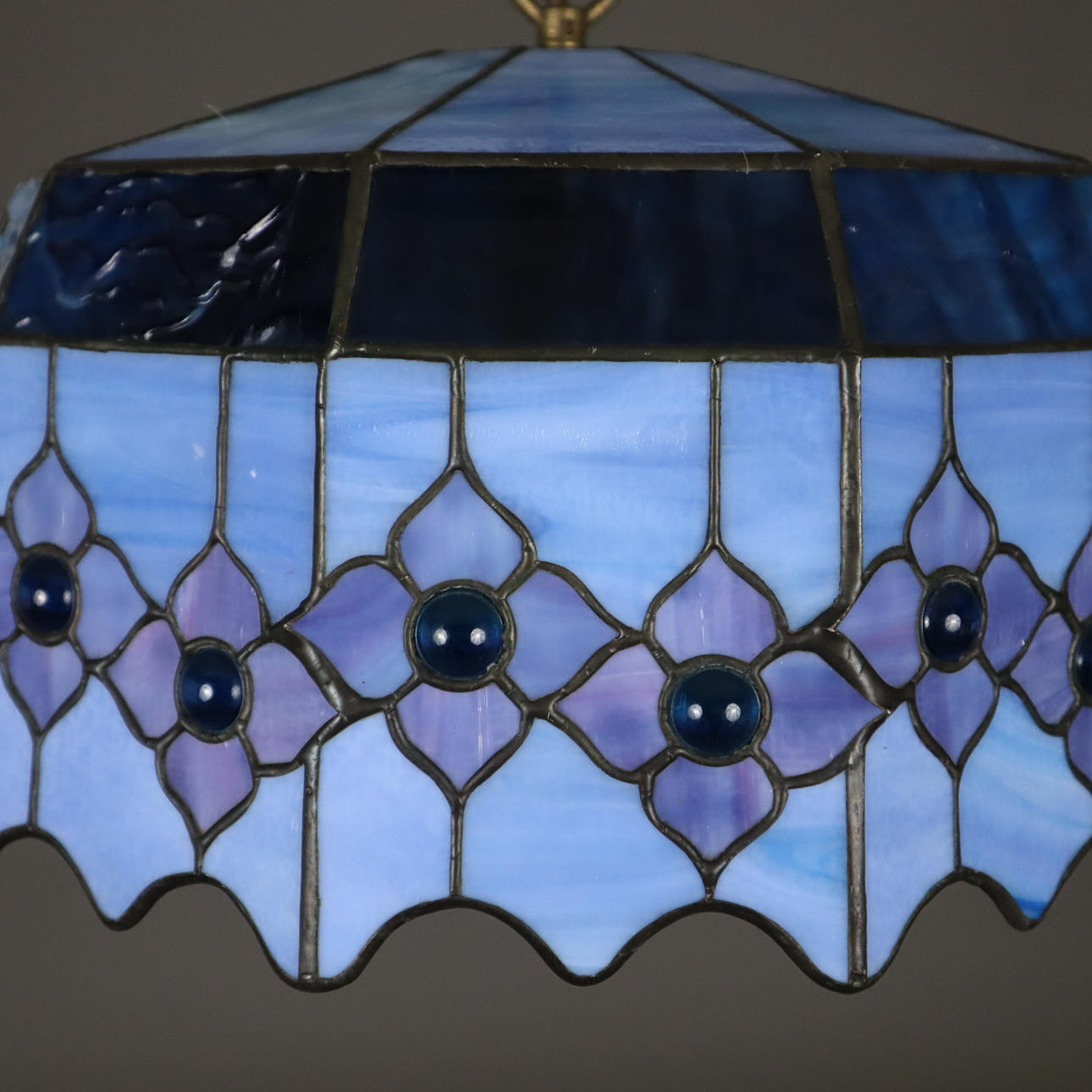 10-sidet glasskærm i nuancer af blå og lilla, blybånd, stiliseret blomsterdekoration med halvkugler af blåt glas, elektrificeret med et lys, HxD:ca. 20x40cm, længde med ophæng op til ca. 72cm.