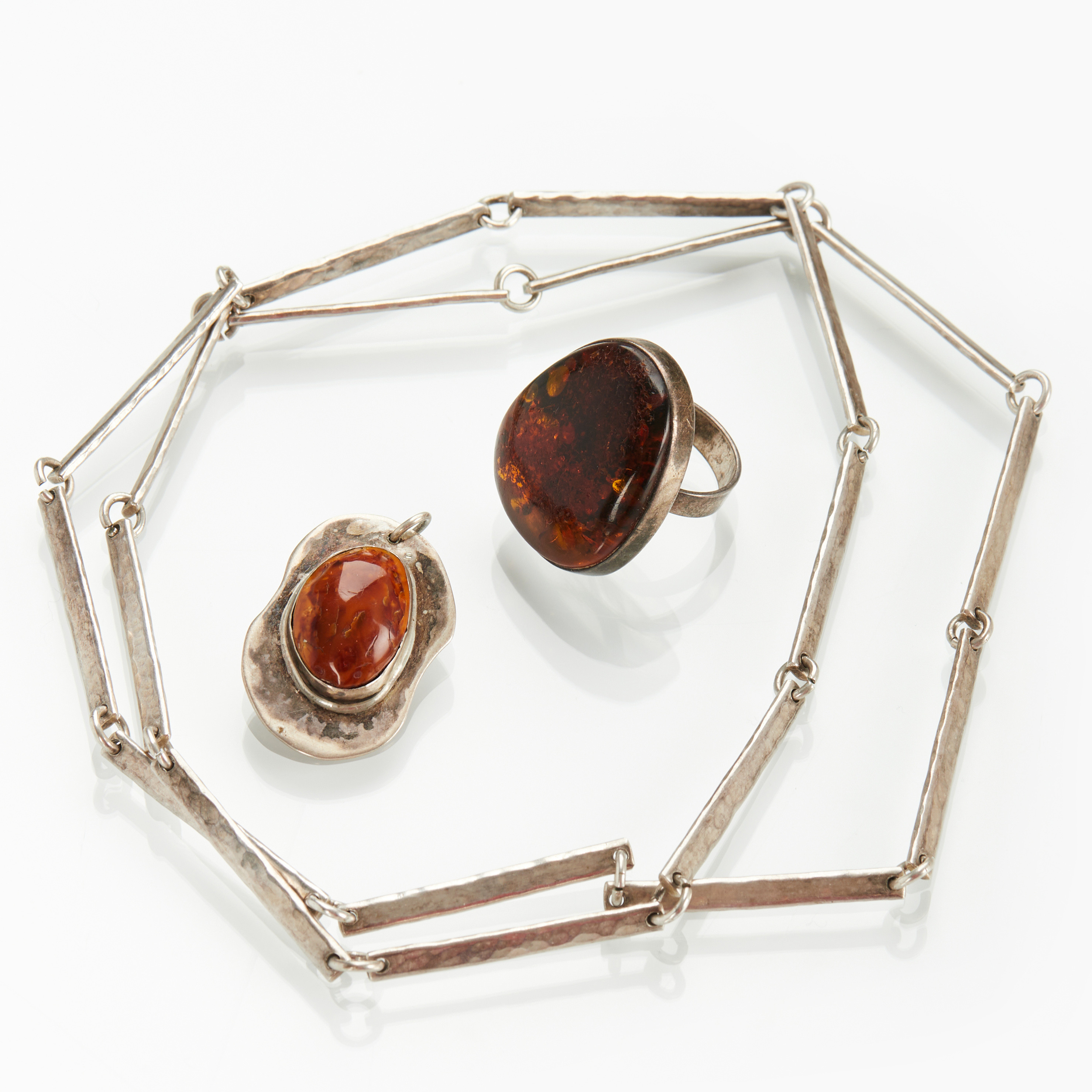 2984448. SØLVSMYKKER. 3 dele. Halskæde, ring og vedhæng.