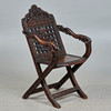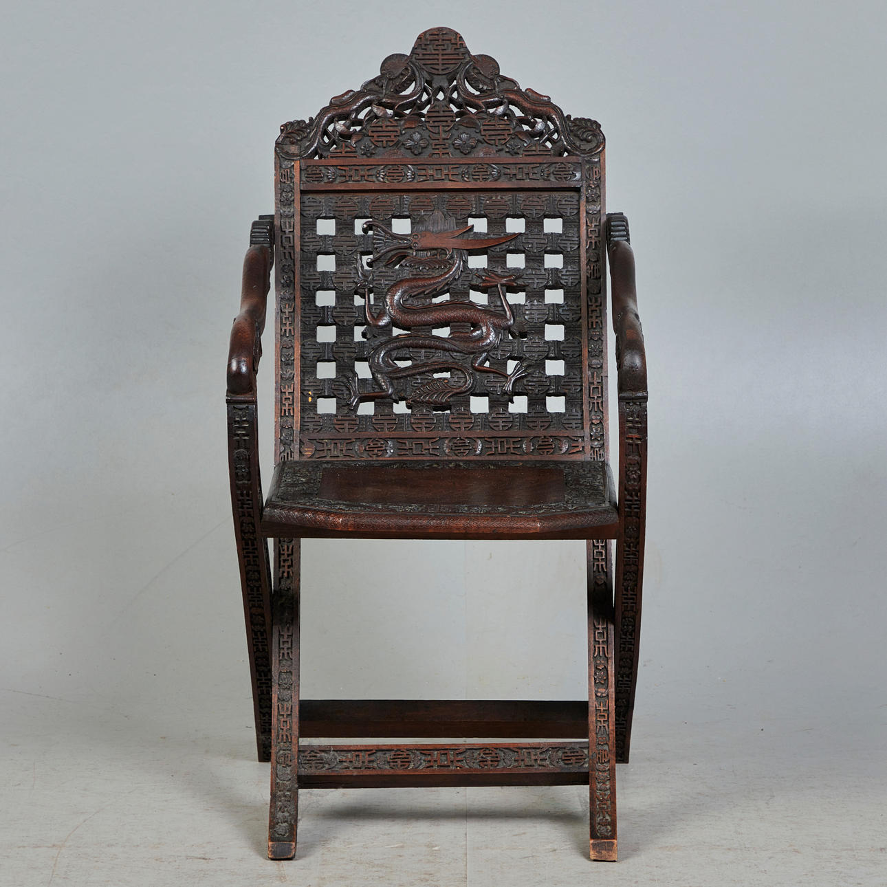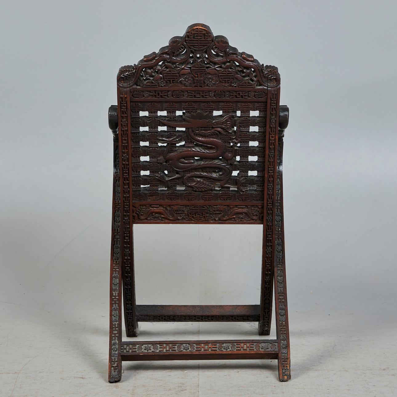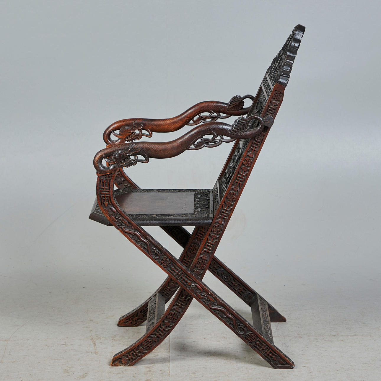 Asiatisk stol / saksestol, træ. Struktur lavet af glaseret, udskåret træ med sakseben, der forestiller asiatiske motiver og ornamenter og armlæn i form af en drage, H.102cm, sædehøjde: 46cm, B.51cm, D.60cm.