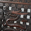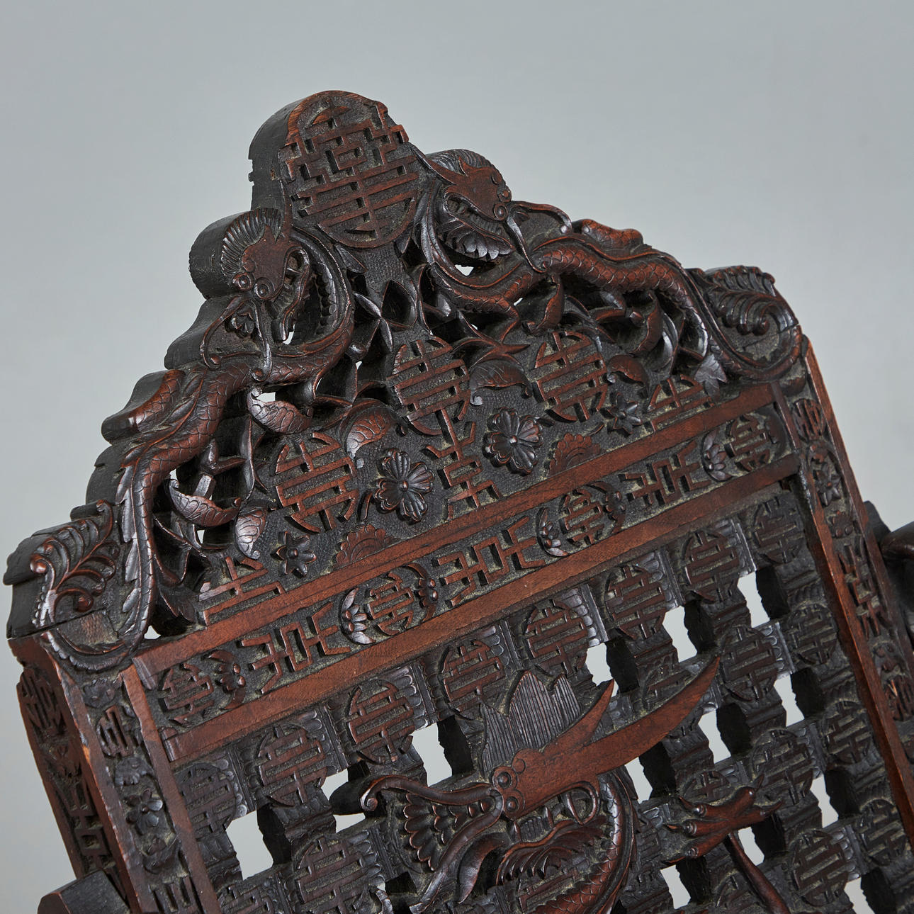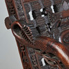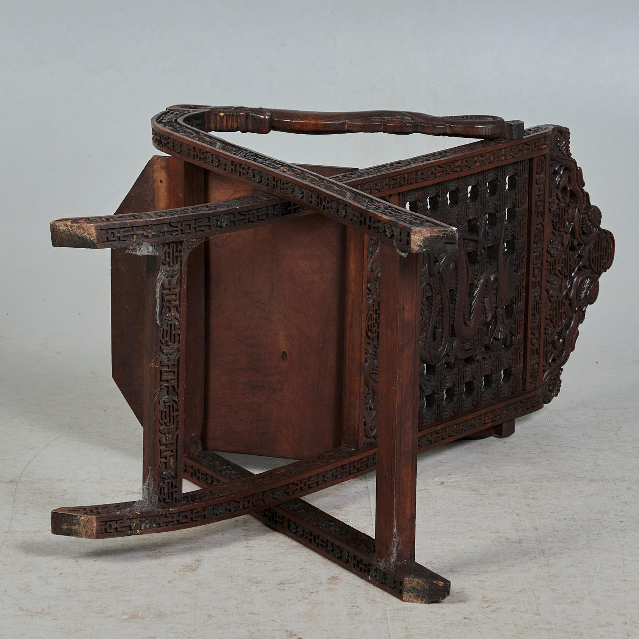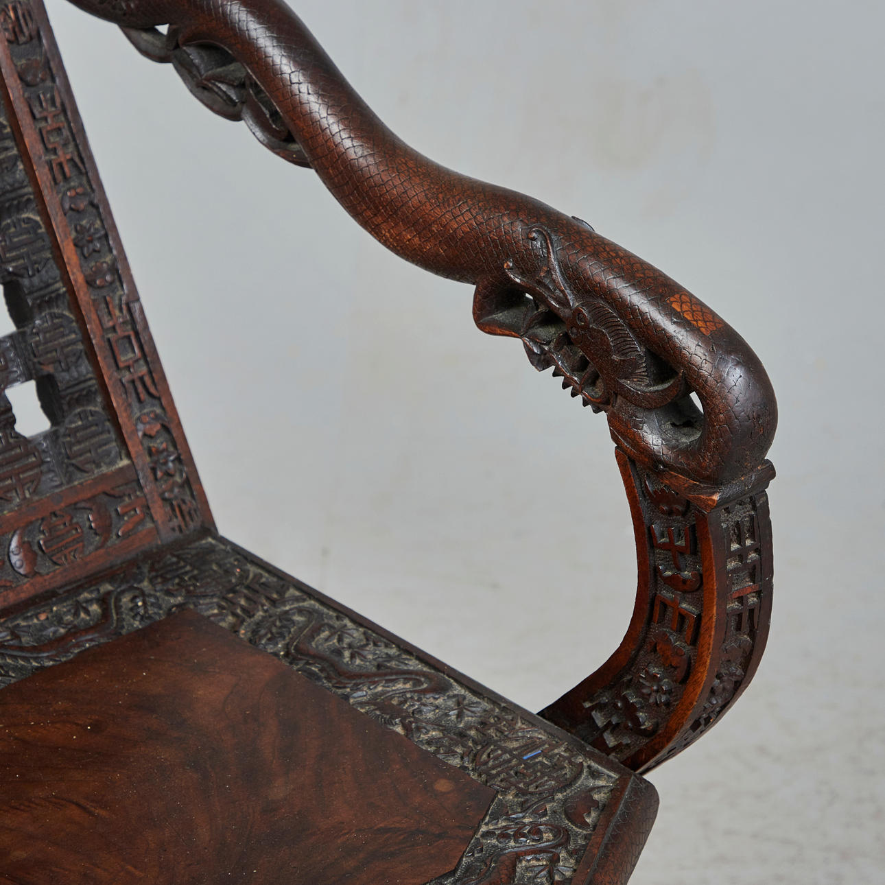 Asiatisk stol / saksestol, træ. Struktur lavet af glaseret, udskåret træ med sakseben, der forestiller asiatiske motiver og ornamenter og armlæn i form af en drage, H.102cm, sædehøjde: 46cm, B.51cm, D.60cm.