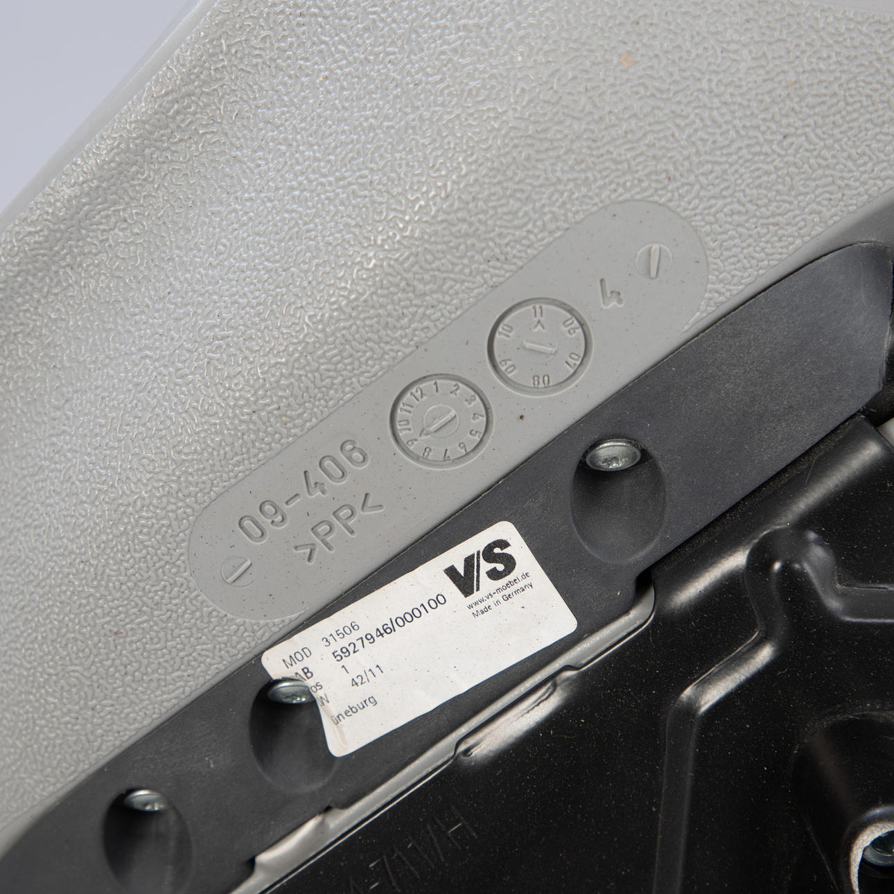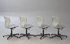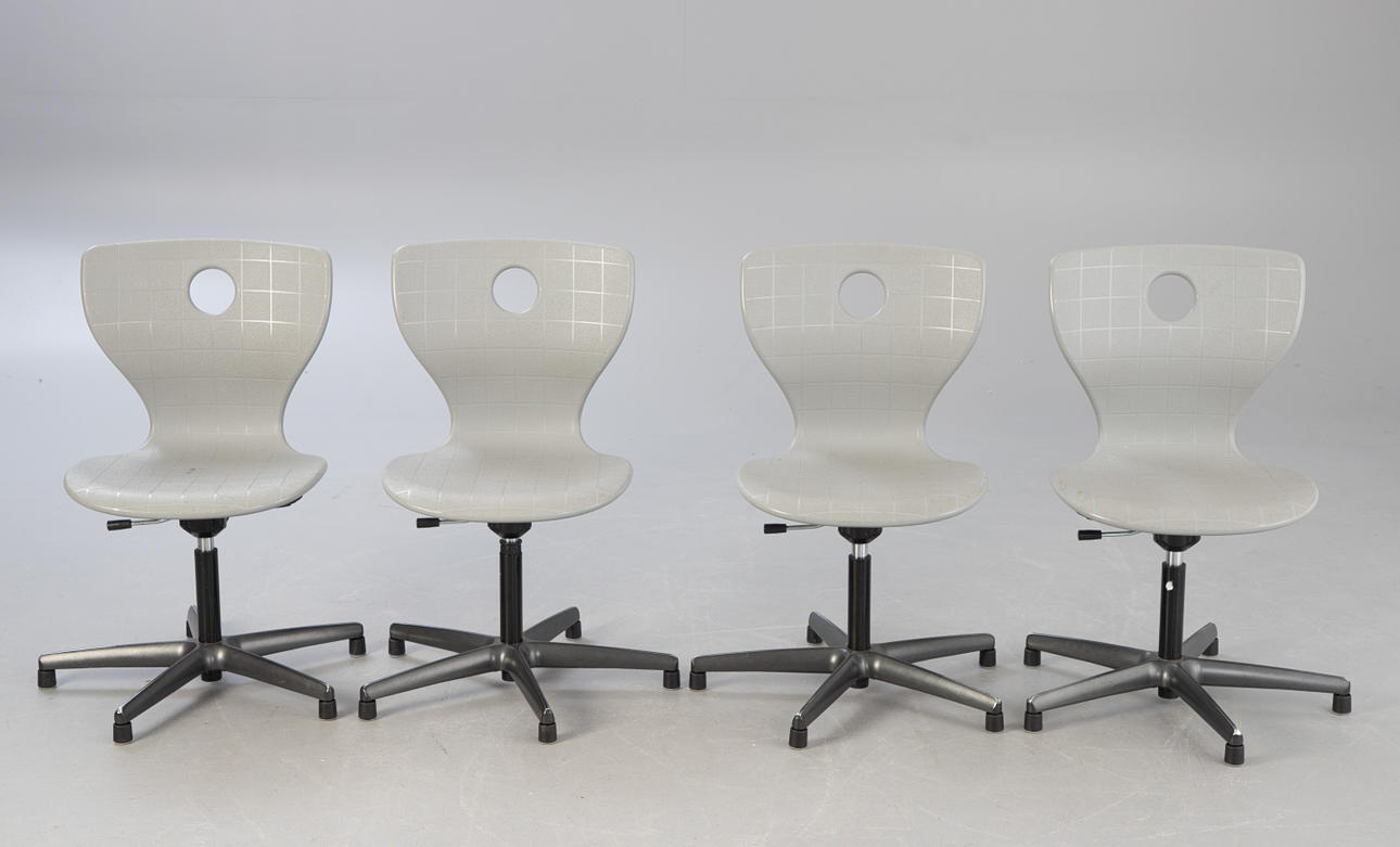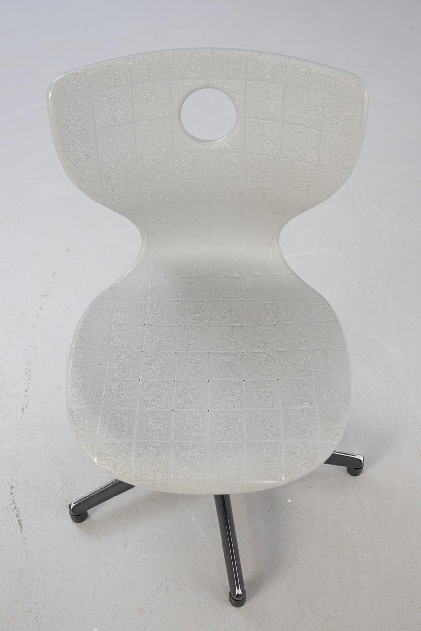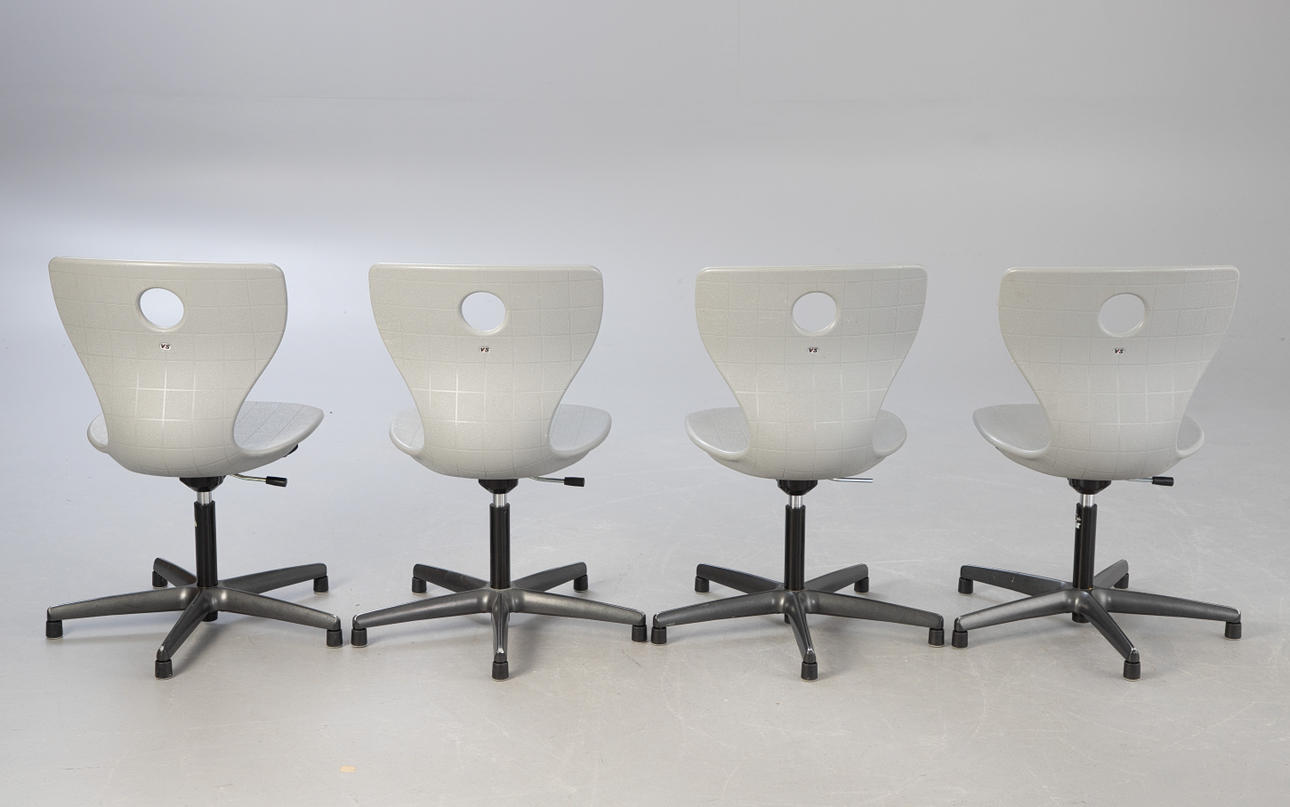 8 Panto Move-LuPo drejestole fra Verner Panton til VS. Ramme bestående af en krydsbund af aluminium og en gasfjeder med plastdæksel, højdejusterbar. Sædeskal af dobbeltvægget, struktureret polypropylen med luftpudeeffekt (LuPo) i lysegrå.