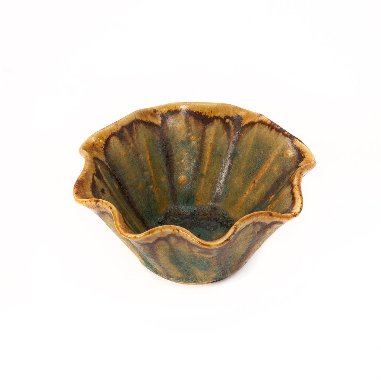 Glaseret stentøj, med foldet kant, monogram signeret og nummereret 109, højde ca 6 cm. Diameter ca 11 cm.