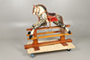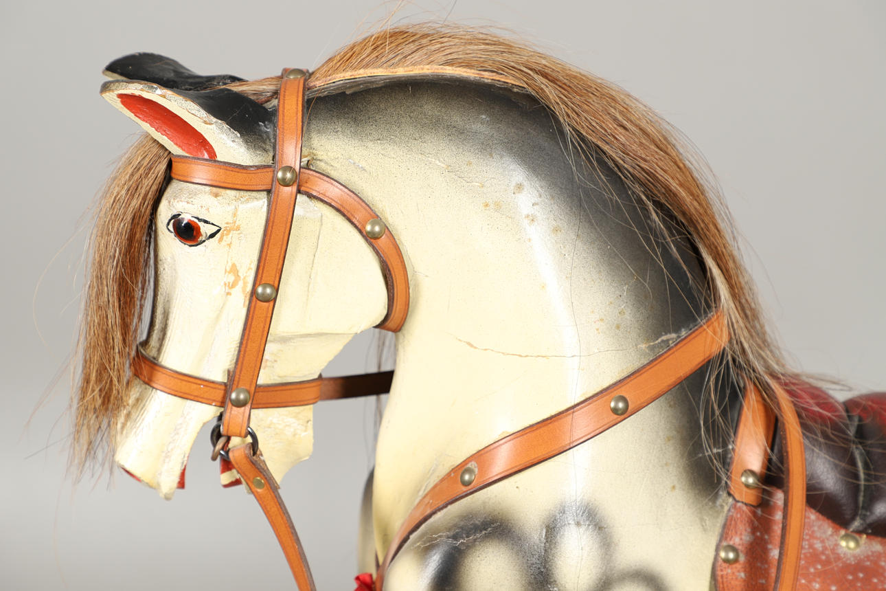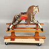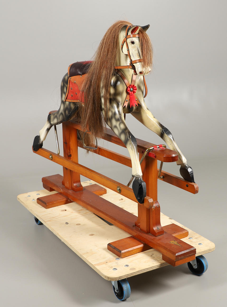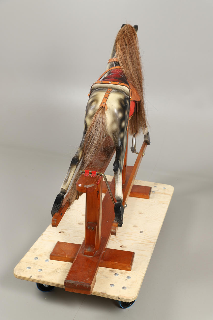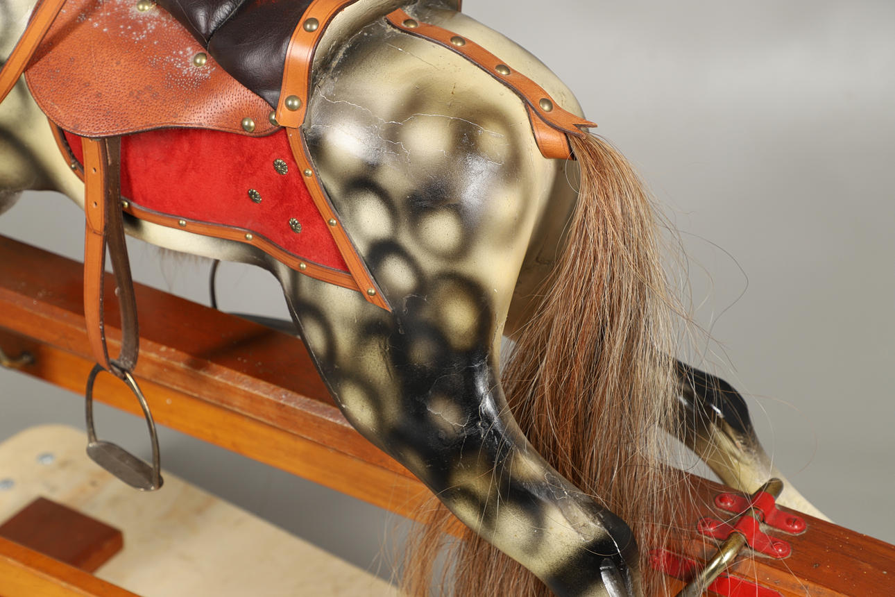 En plettet grå gyngehest med man og hale monteret med sadel og stigbøjler, på en bejdset fyrretræsbund med 'Leeway'-overførselsetiket til basen. 104 cm høj, 132 cm bred.