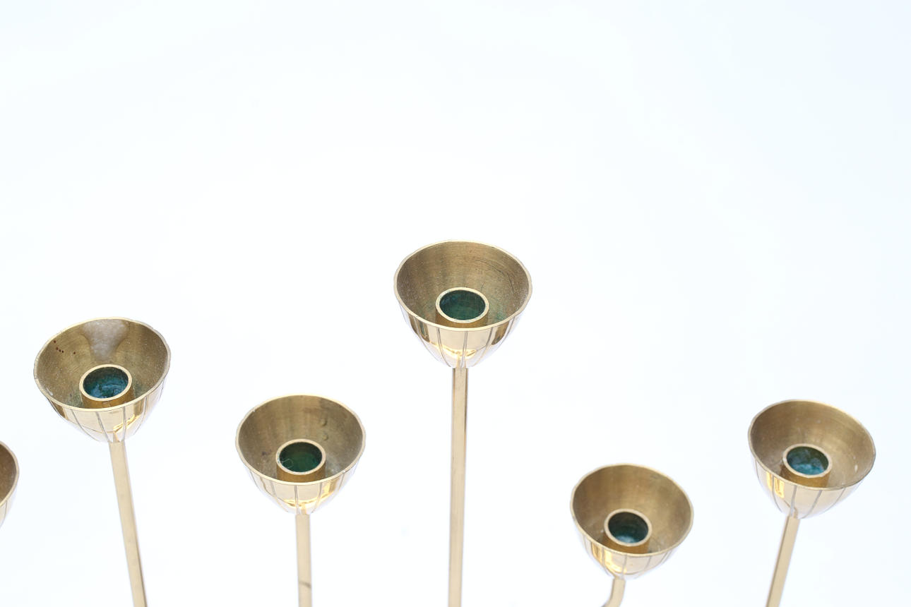 Seks lysestager, mindre lysmodel. Højde ca 26,5 cm. Bredde ca 29,5 cm.