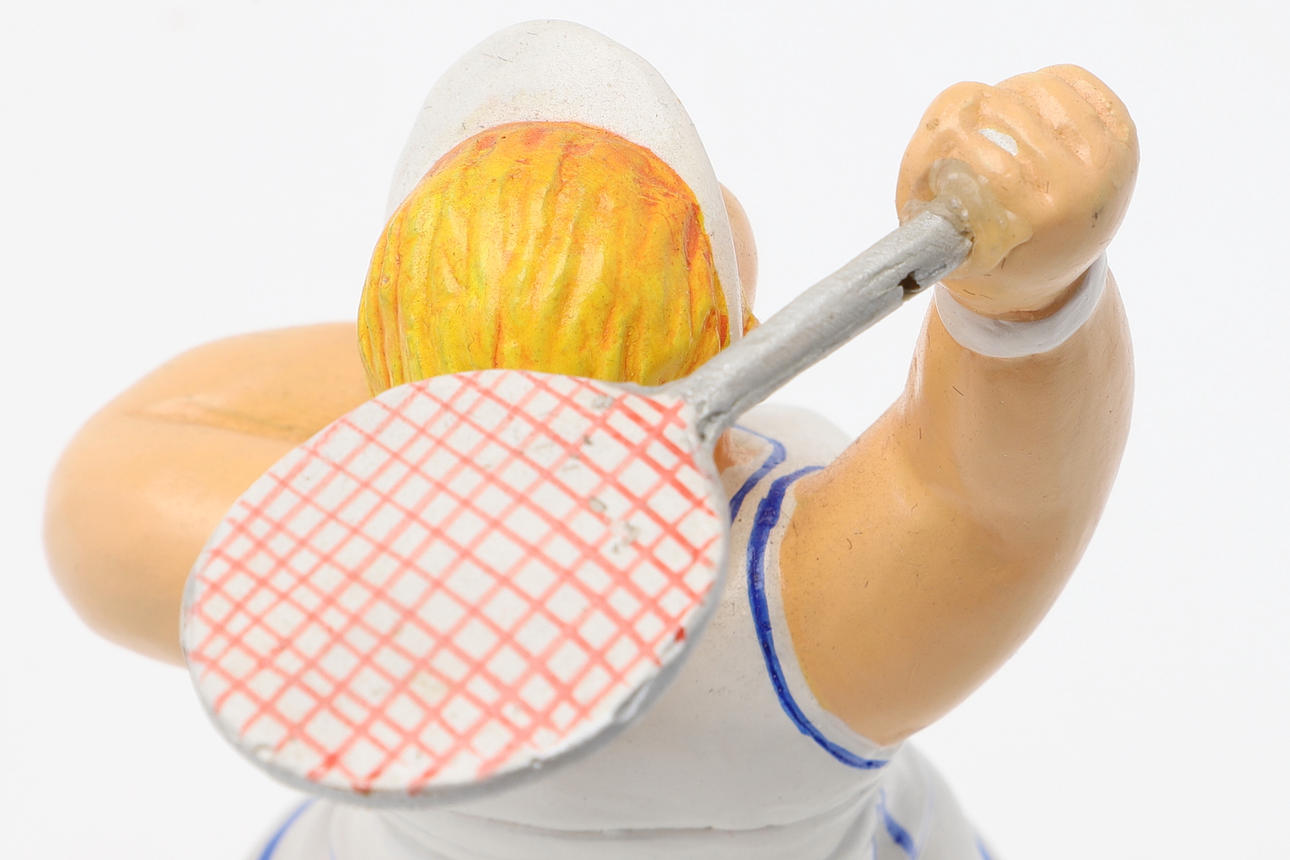 Badmintonstativ fastgøres med lim ved hånden. Overfladesnavs.