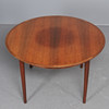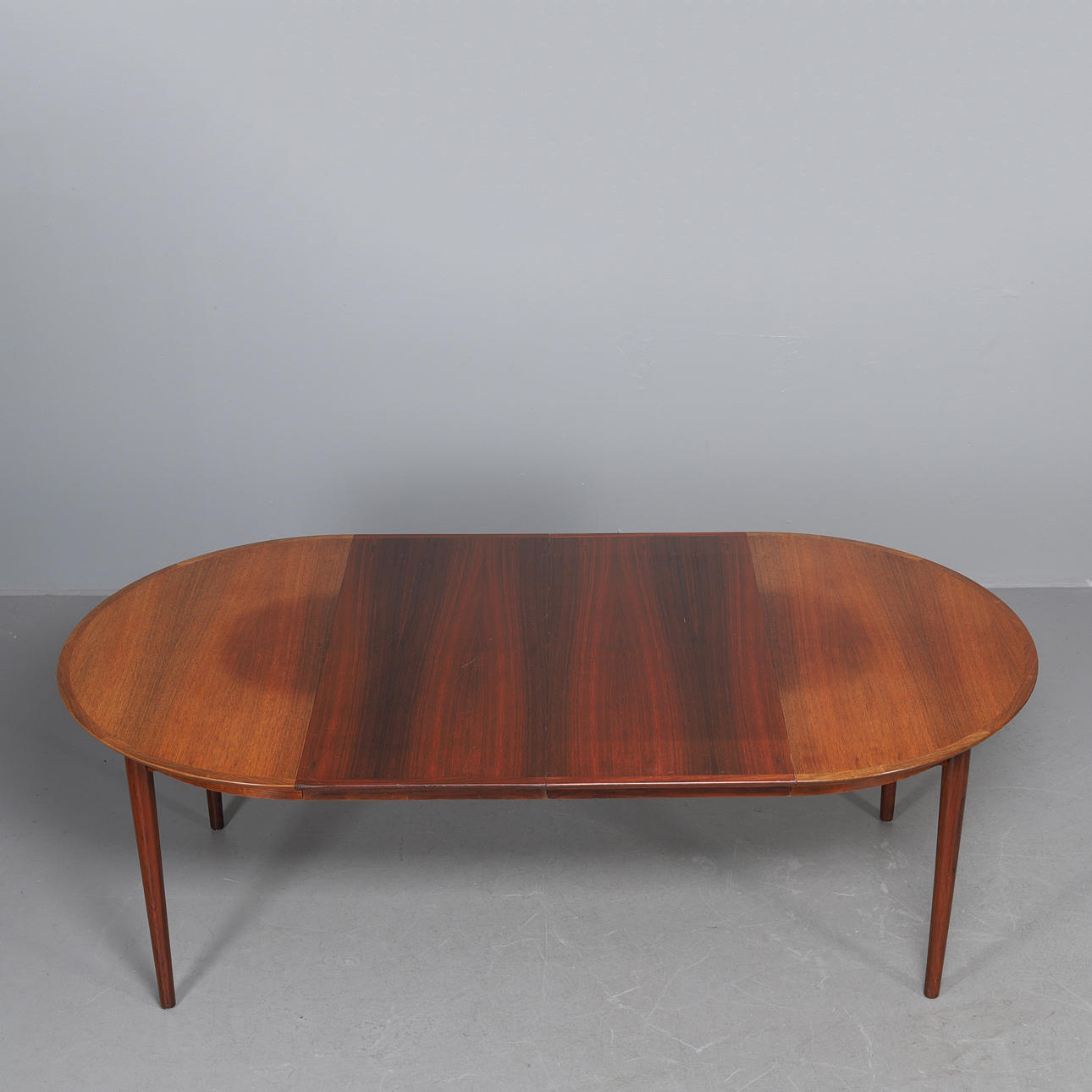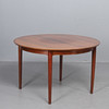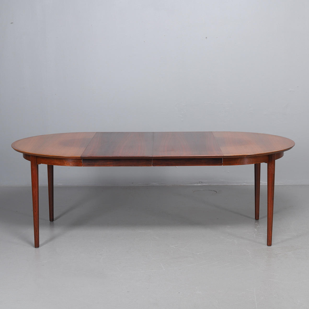 Rundt spisebord i palisanderfiner, to indsatsbrædder med 49,5 cm kant Mål: Ø 120 cm, højde 74 cm. Største længde med 2 skær 219 cm Cites certifikat medfølger