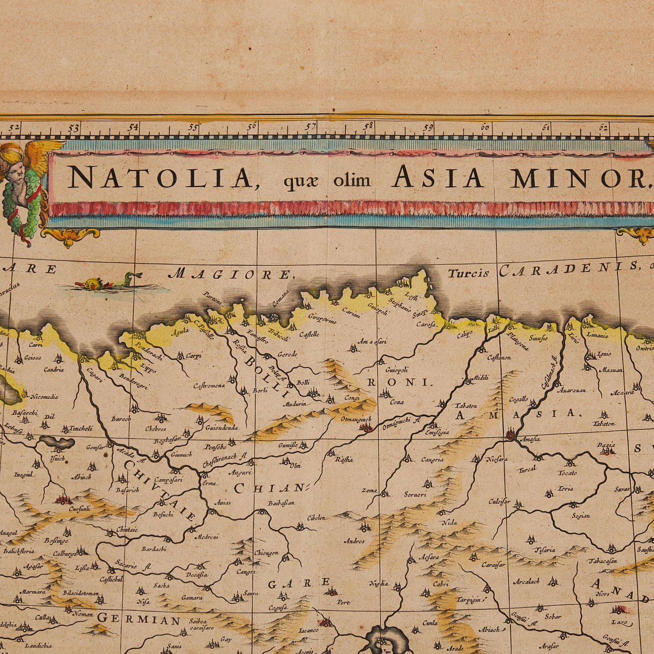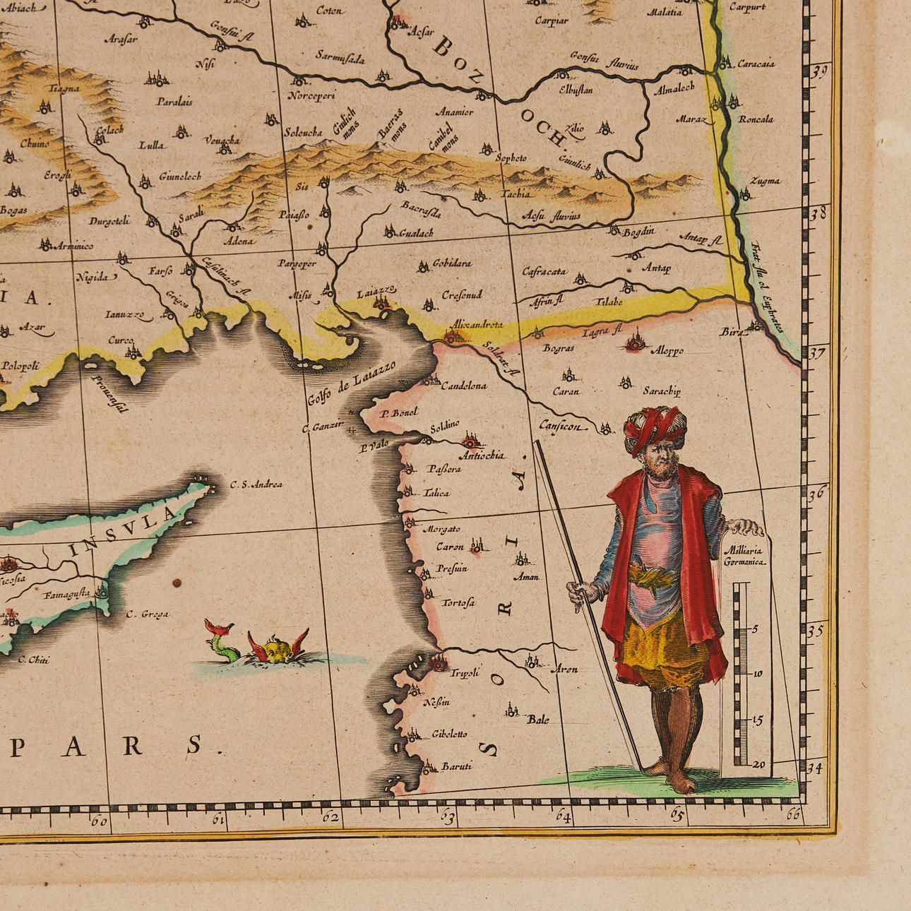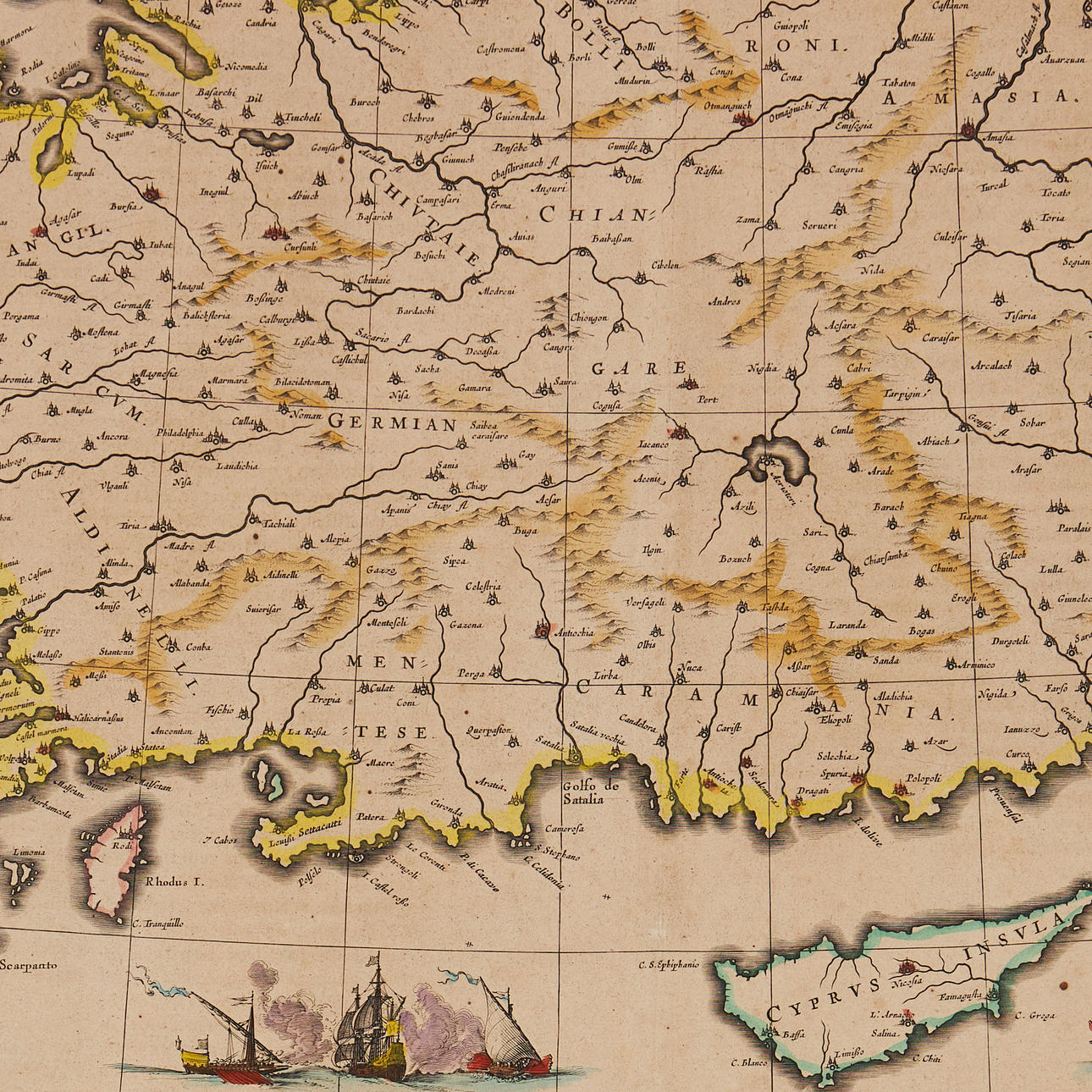 BLAEU, Willem Janszoon. Natolia, quae olim Lilleasien [med Cypern]. Amsterdam ca 1634.. Håndkoloreret indgraveret kort med kartouche øverst, havdyr, sejlskibe (kampscene) og en mand stående ved siden af vægten. Cirka 385 x 500 mm. Latinsk tekst på verso side nummer 14.