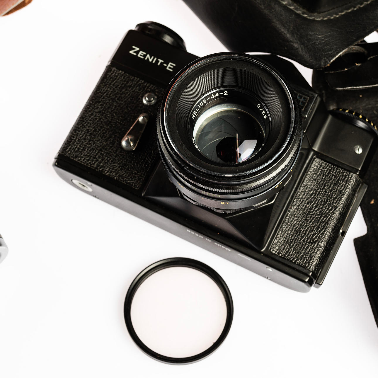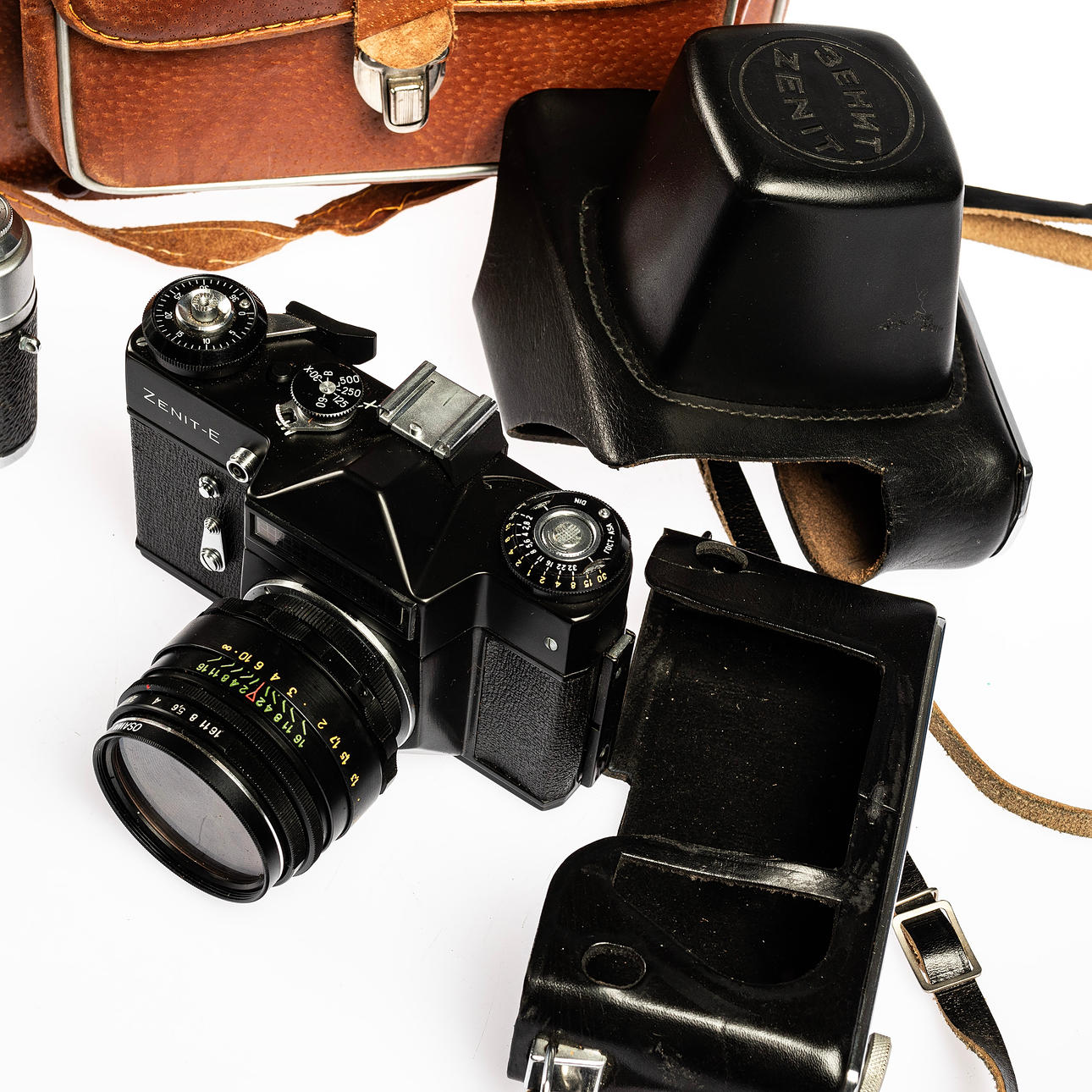 KAMERA, 2 stk, Zenit med tilbehør og objektiv.