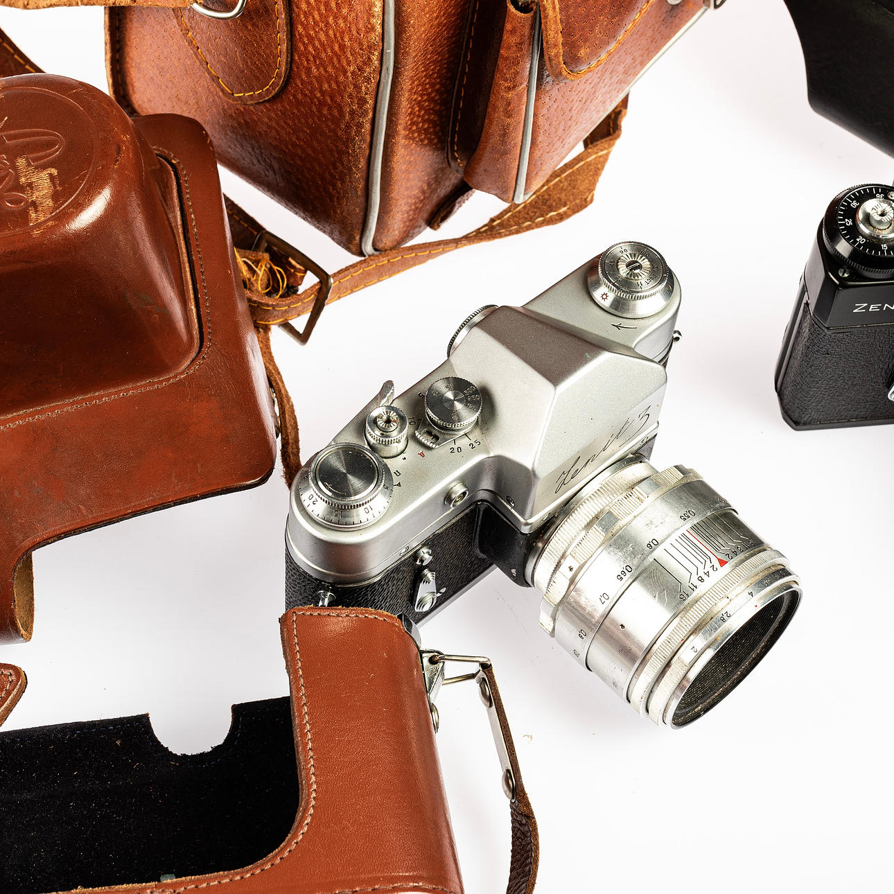 3034252. KAMERA, 2 stk, Zenit med tilbehør og objektiv.