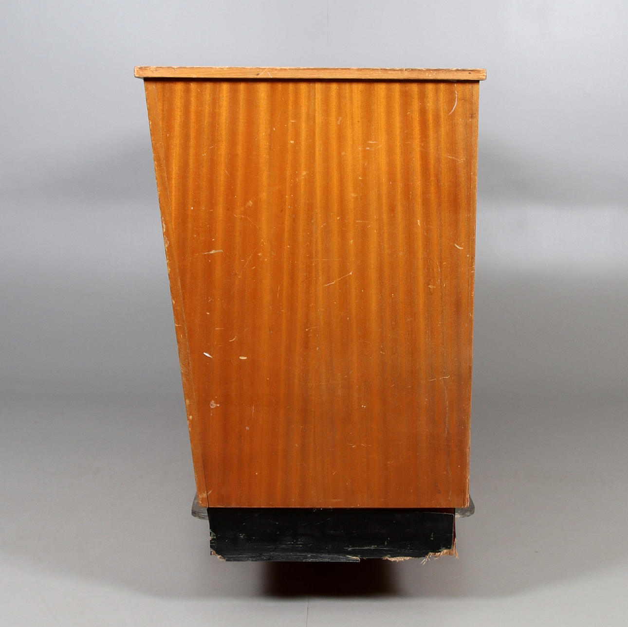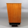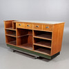Perstorps skive på bordflade. Stel fineret i mahogni. Skuffer øverst på bagsiden og diverse opbevaringsrum.