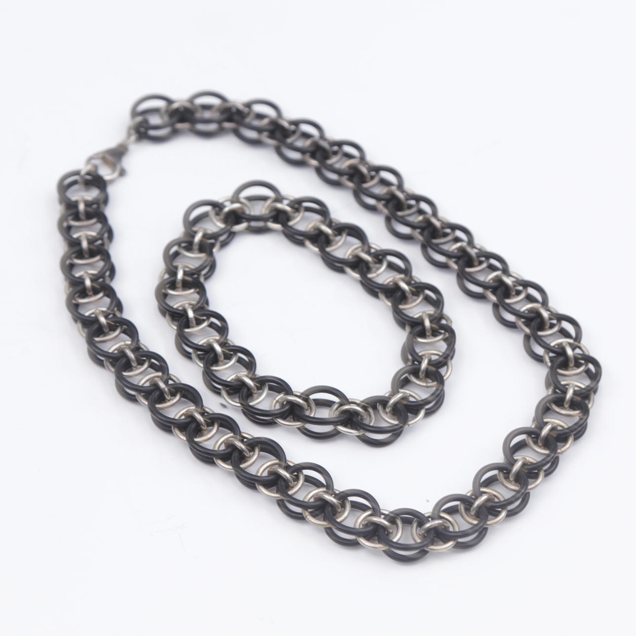 HALSKÆDE og ARMBÅND, sølv/gummi.