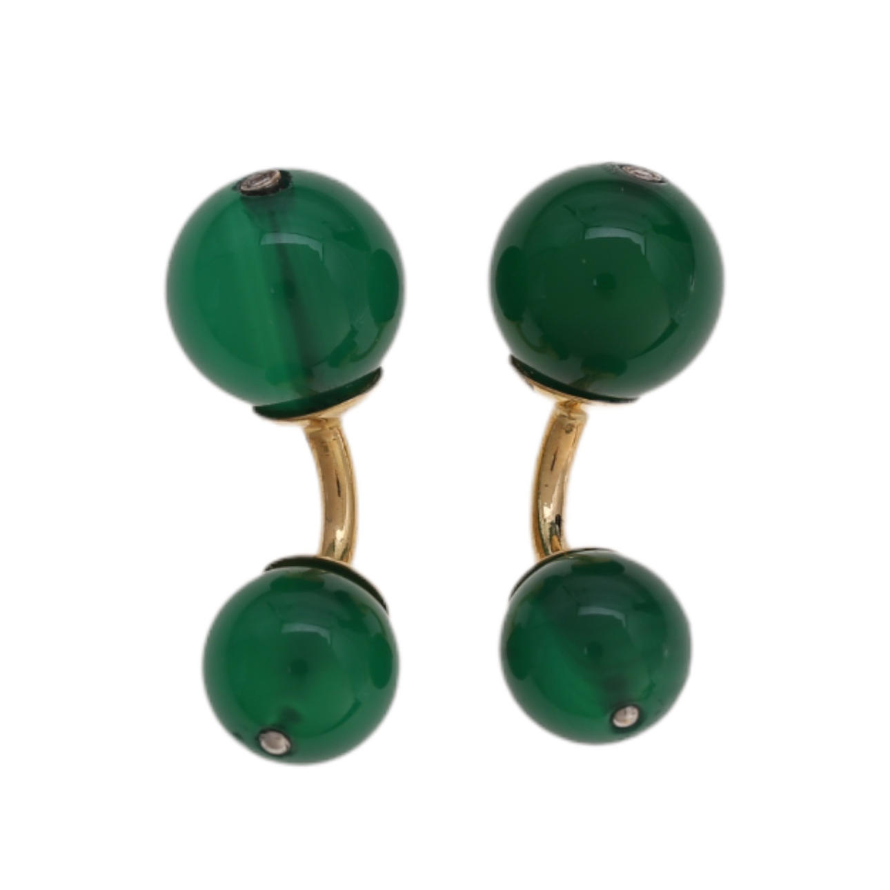 18K guld, brillantslebne diamanter, 0,02 ct og grønne agatperler på 10 og 8 mm i diameter. 5,9 gr.