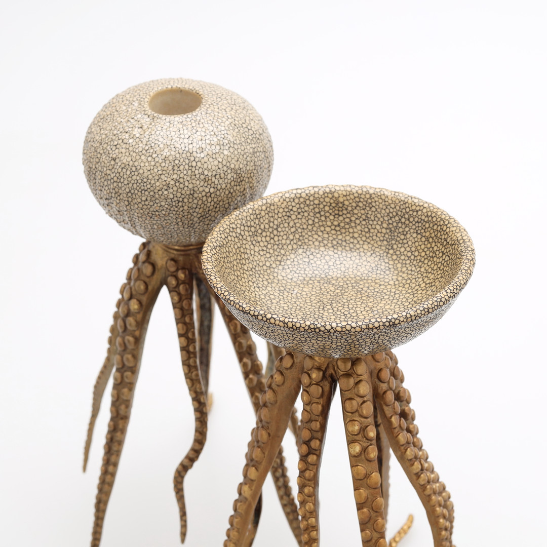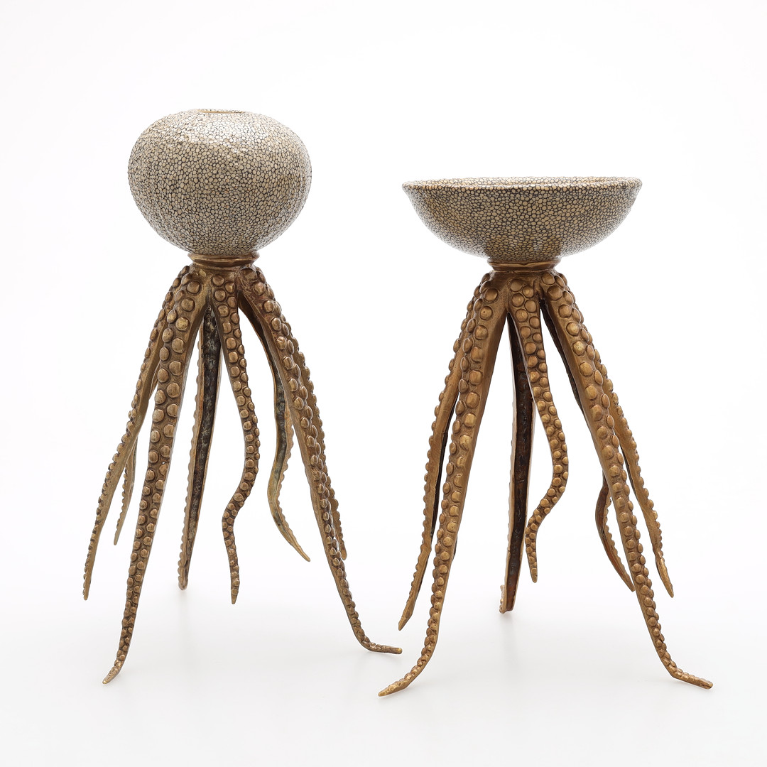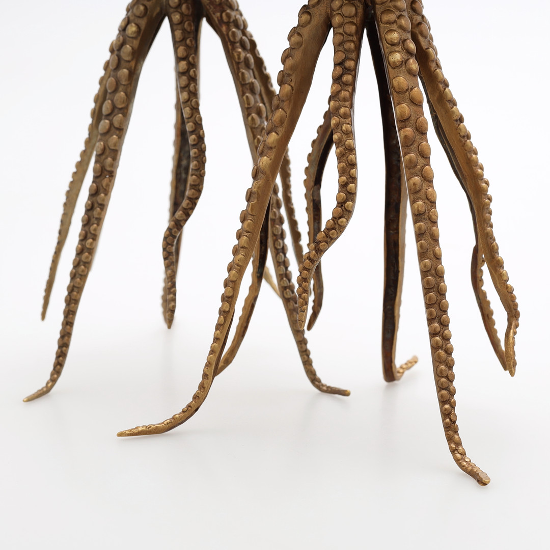 3040626. LYNESTAKER, 2 stk., "Blæksprutte", messing/stentøj, 2000-tallet.