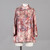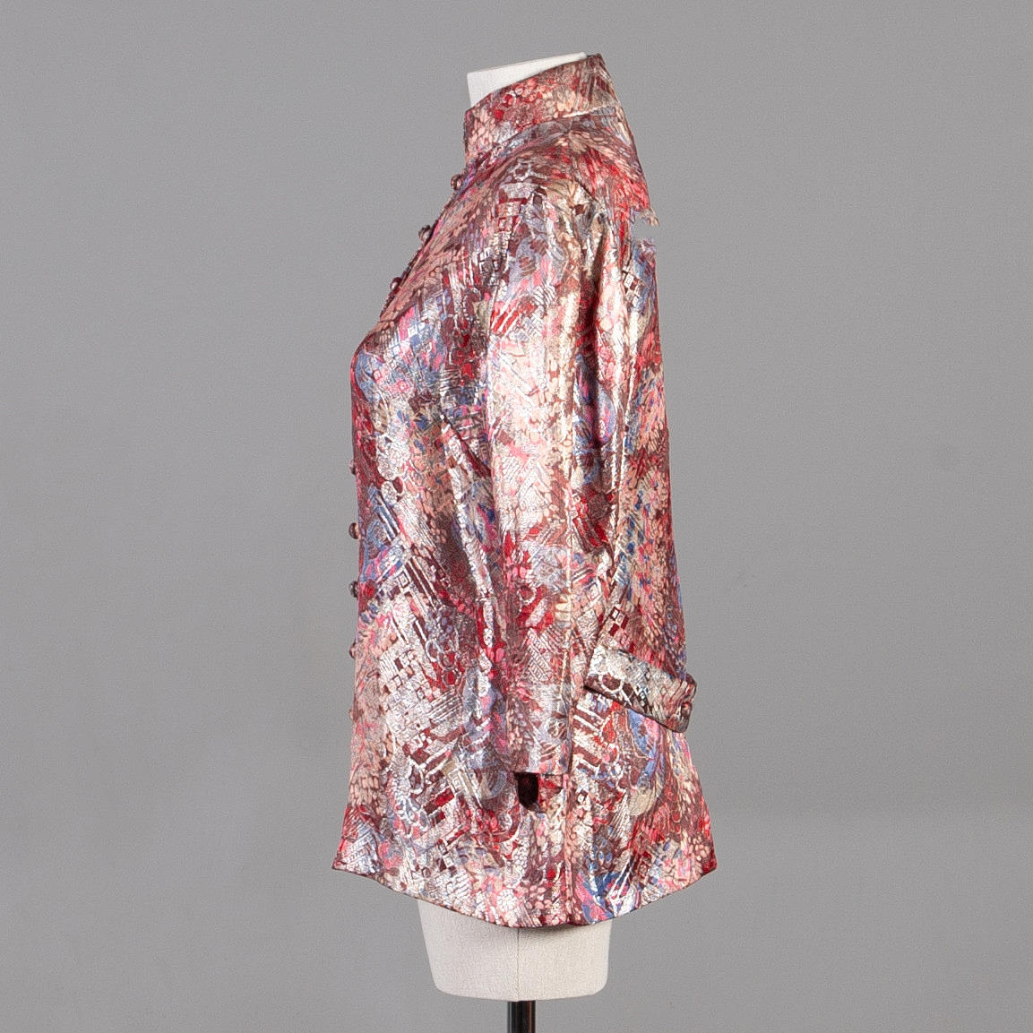 Armlængde 33 cm Skulderkant 67 cm Buste 100 cm Jakke i brokadestof med smukt sølvfarvet skær, beklædte knapper og løkke i ryggen.