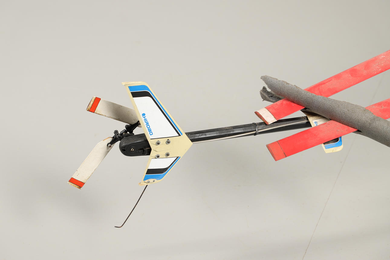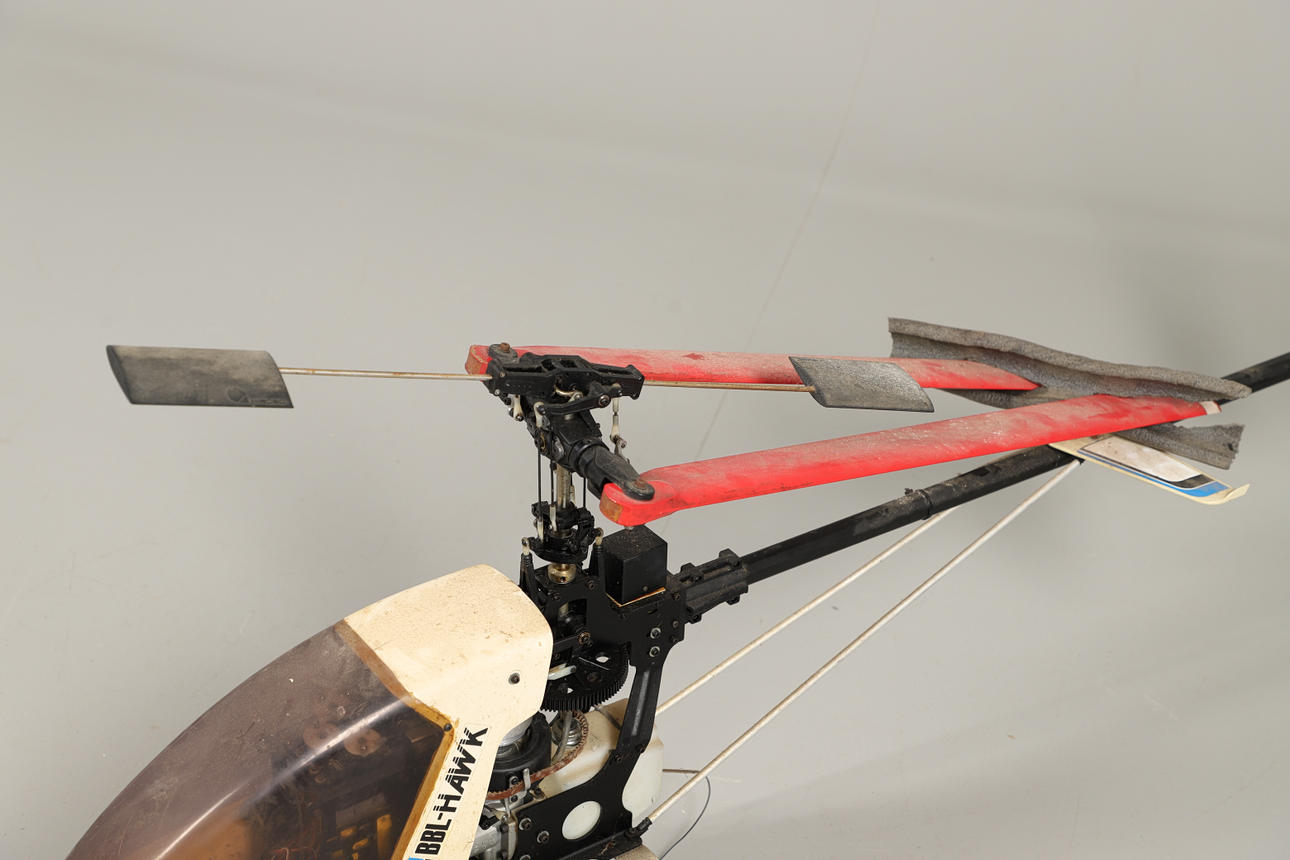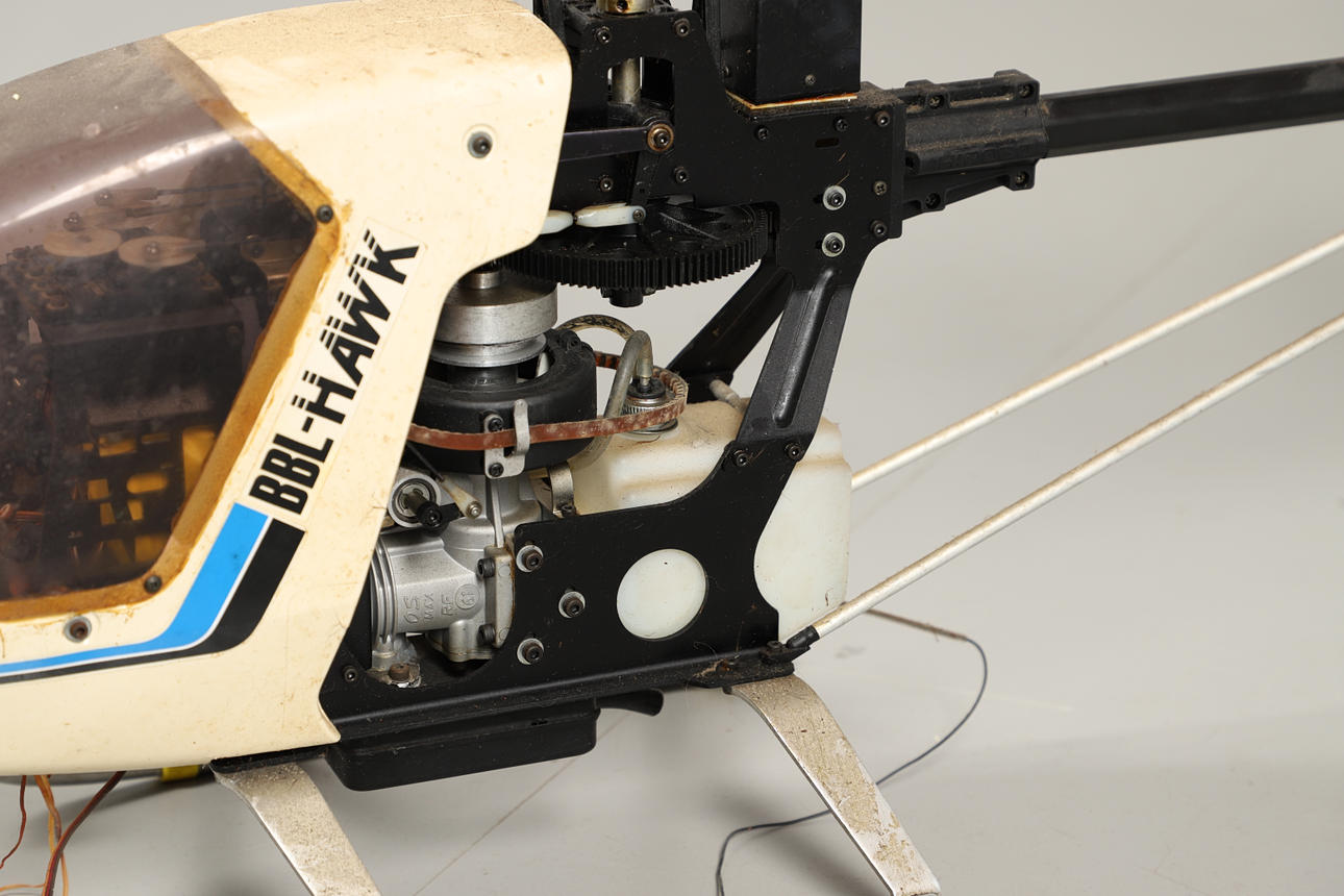 En stor fjernstyret helikopter af Hirobo af en BBL-høg, og udstyret med en benzinmotor. 138 cm høj.