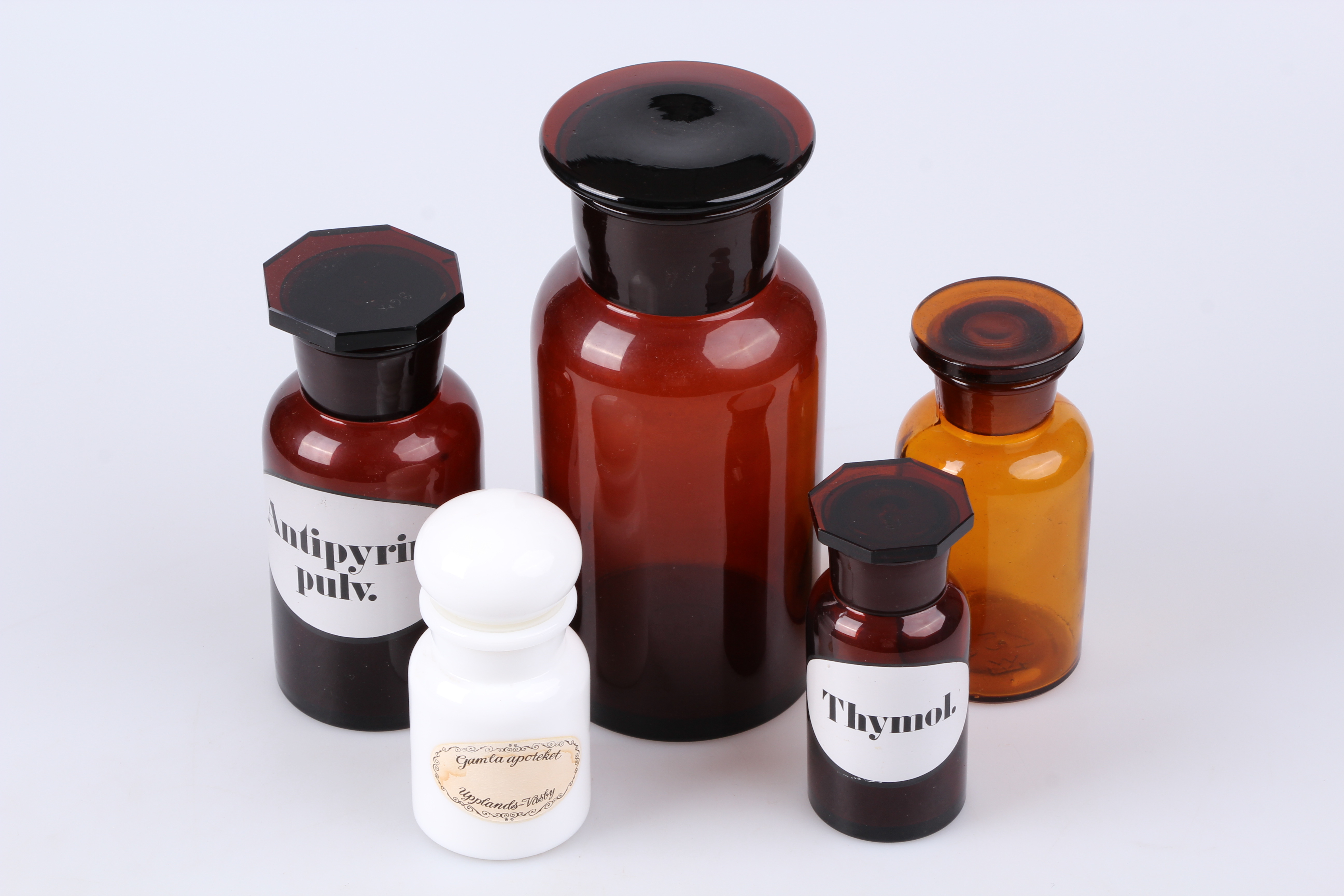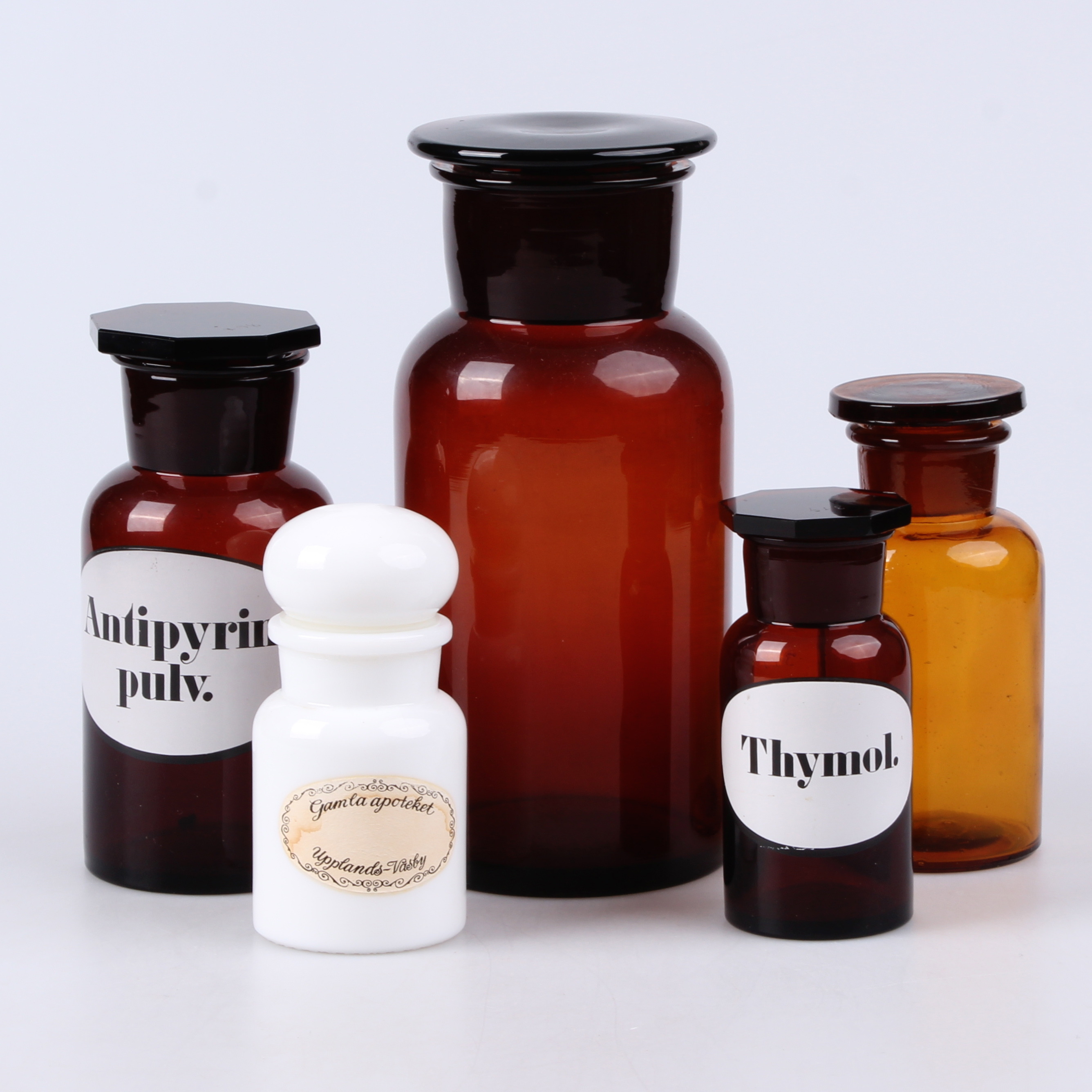 304624. APOTEKKRUKKER, 5 stk. Glas, delvist Malmköping.