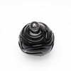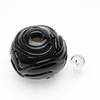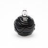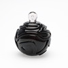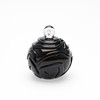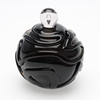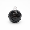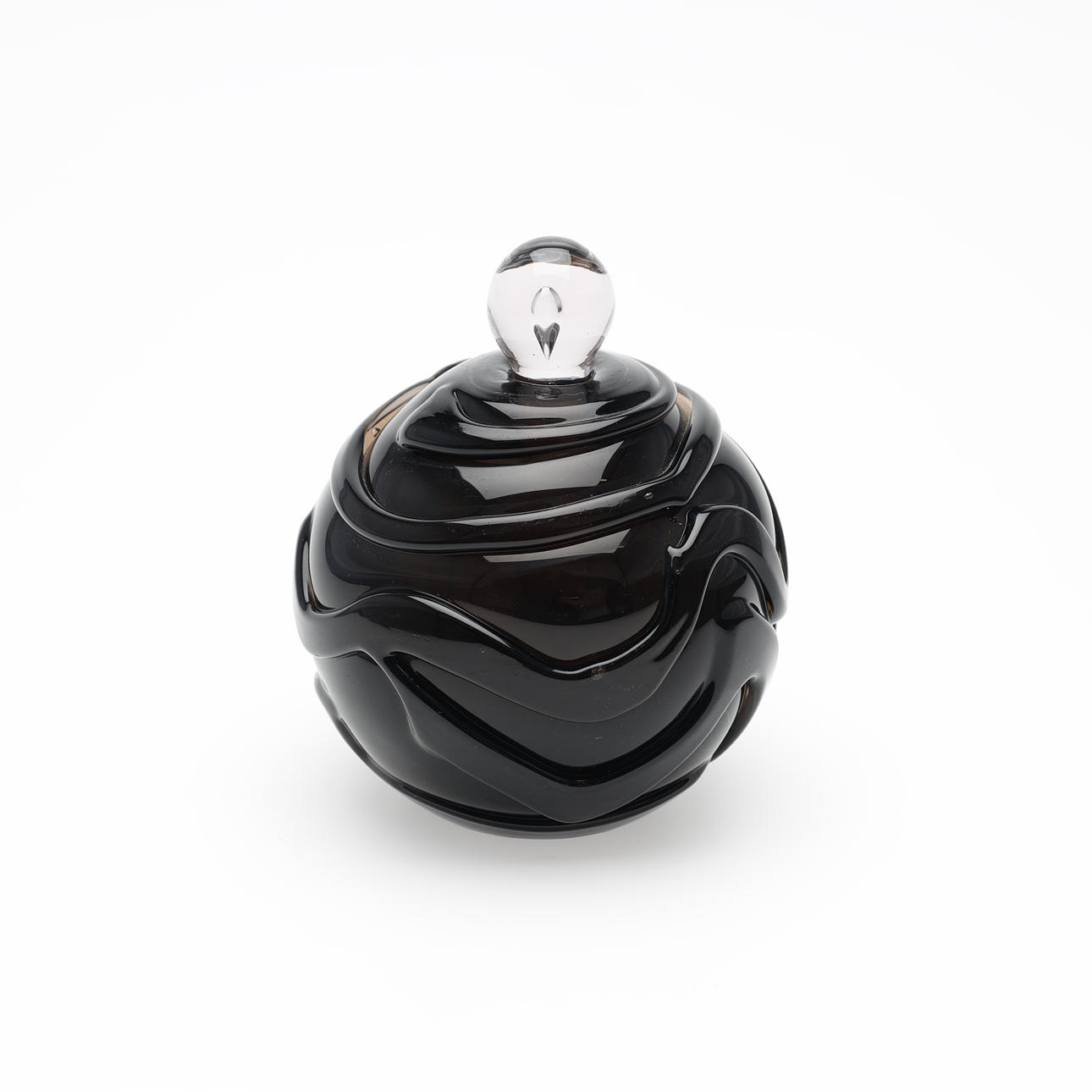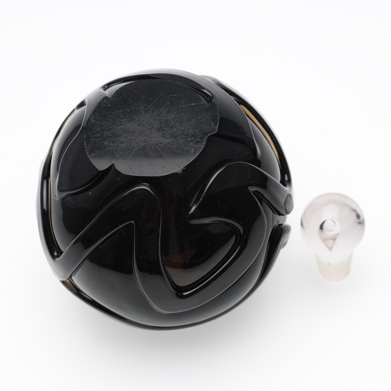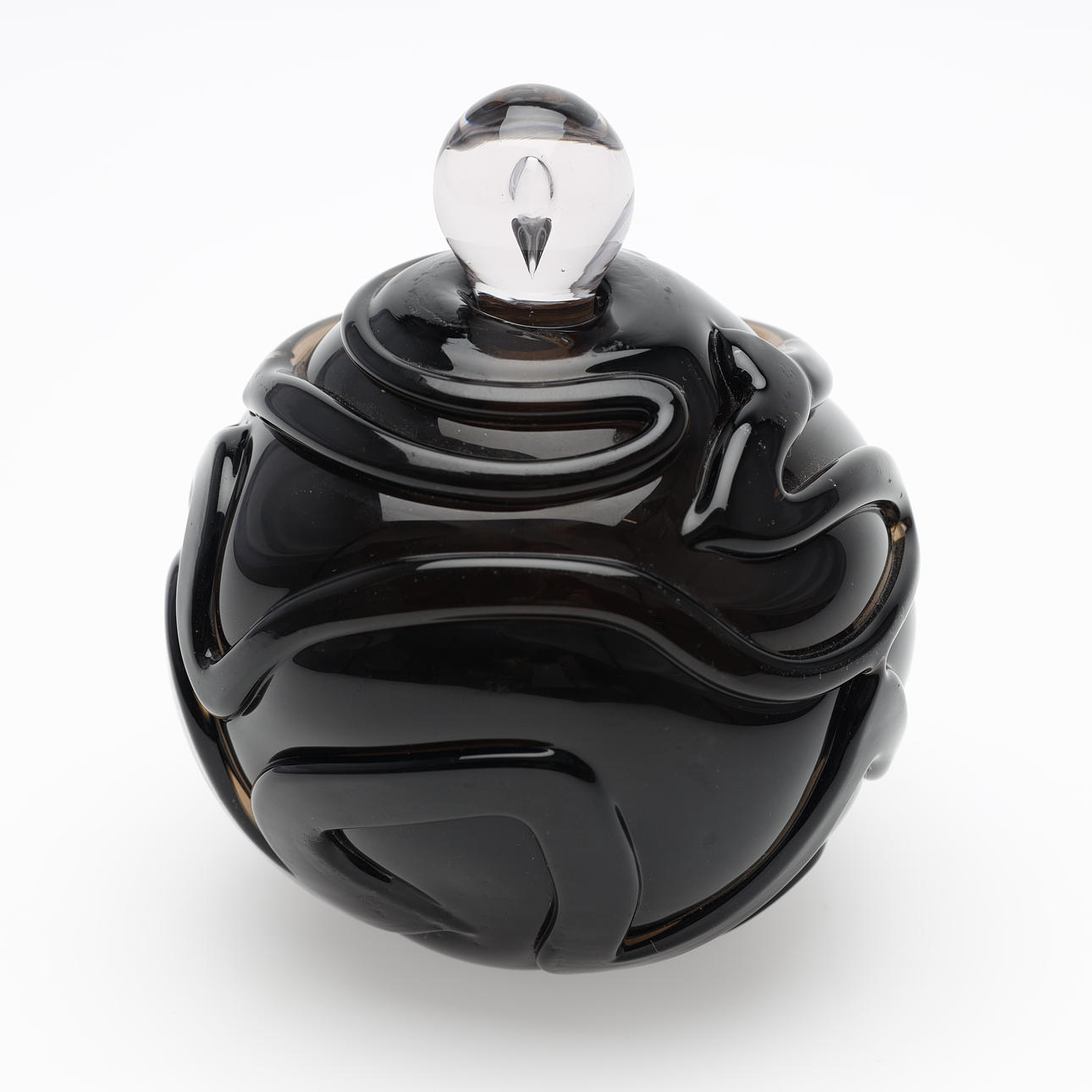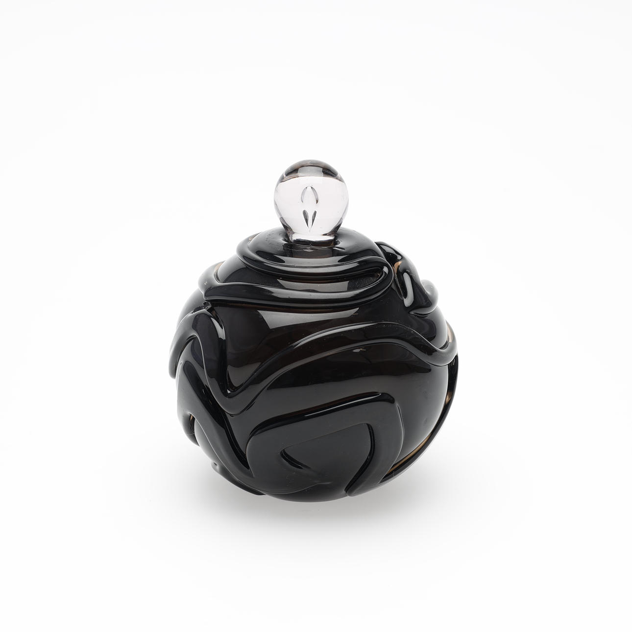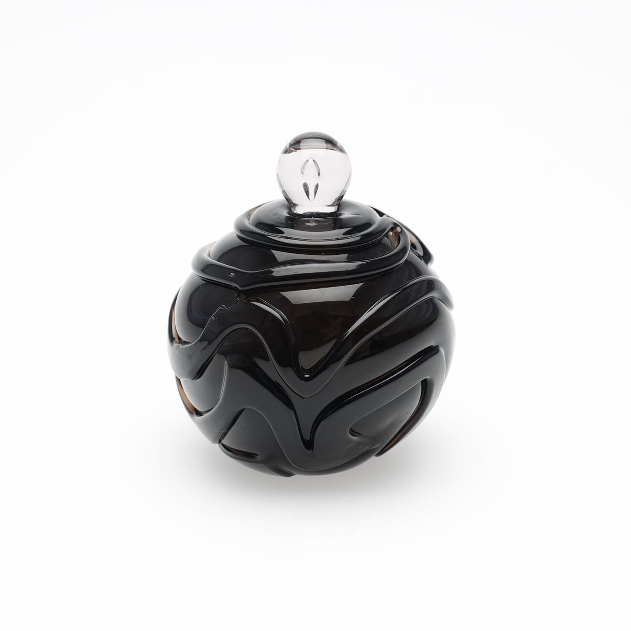 Jacob E. Bang: Røgfarvet og ornamenteret parfumeflakon. Sttopper af hvidt glas med dråbeformet indeslutning.