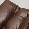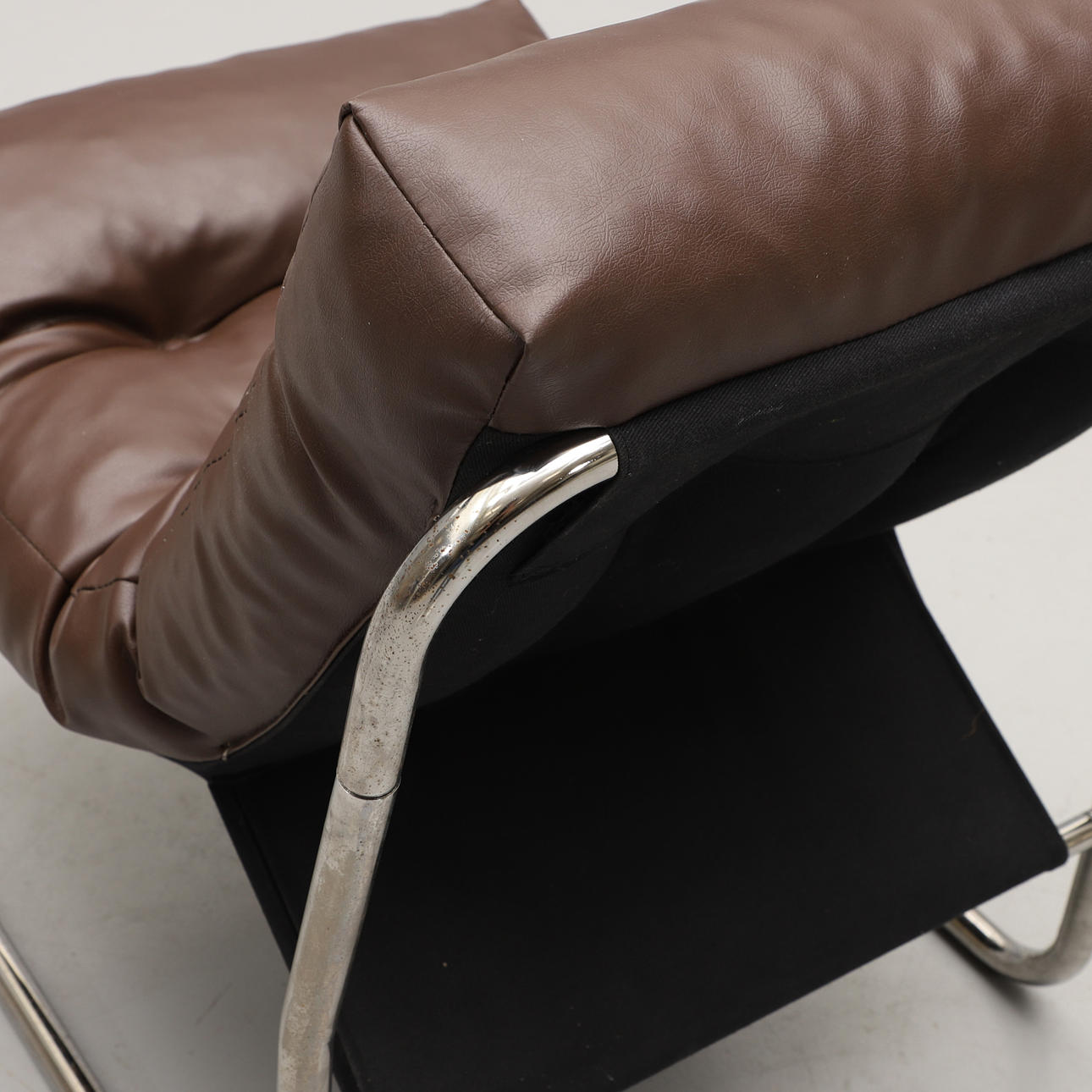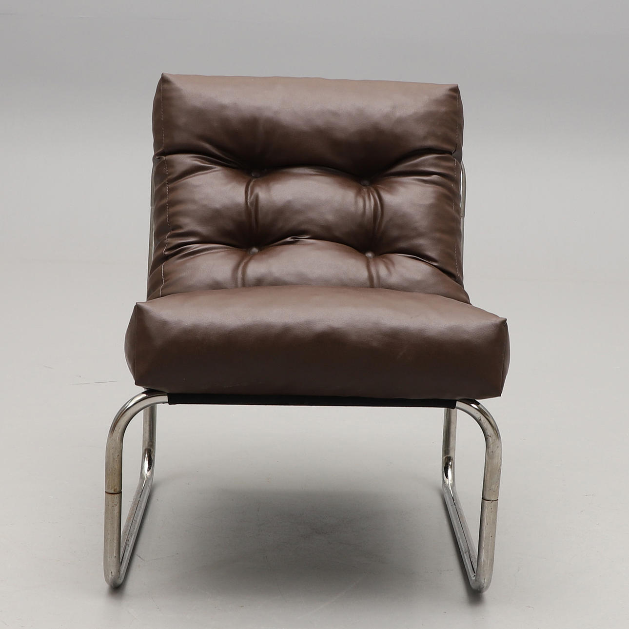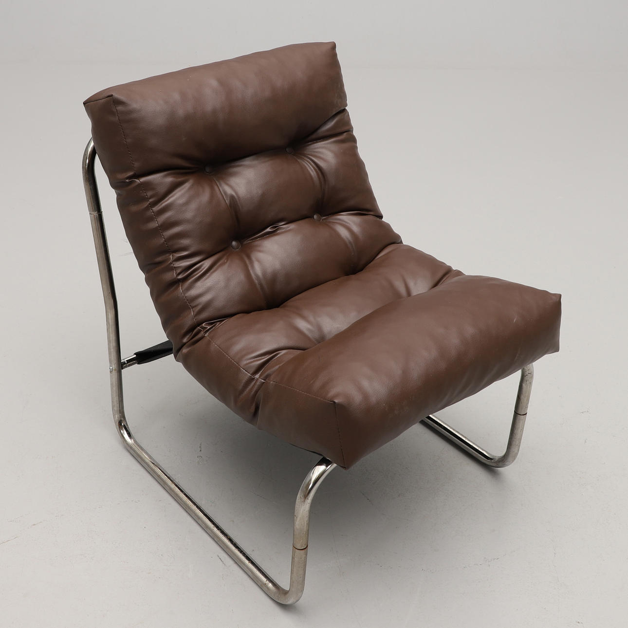 Lænestol med stel i forkromet stålrør og sæde i fast hynde betrukket med brun gallon.