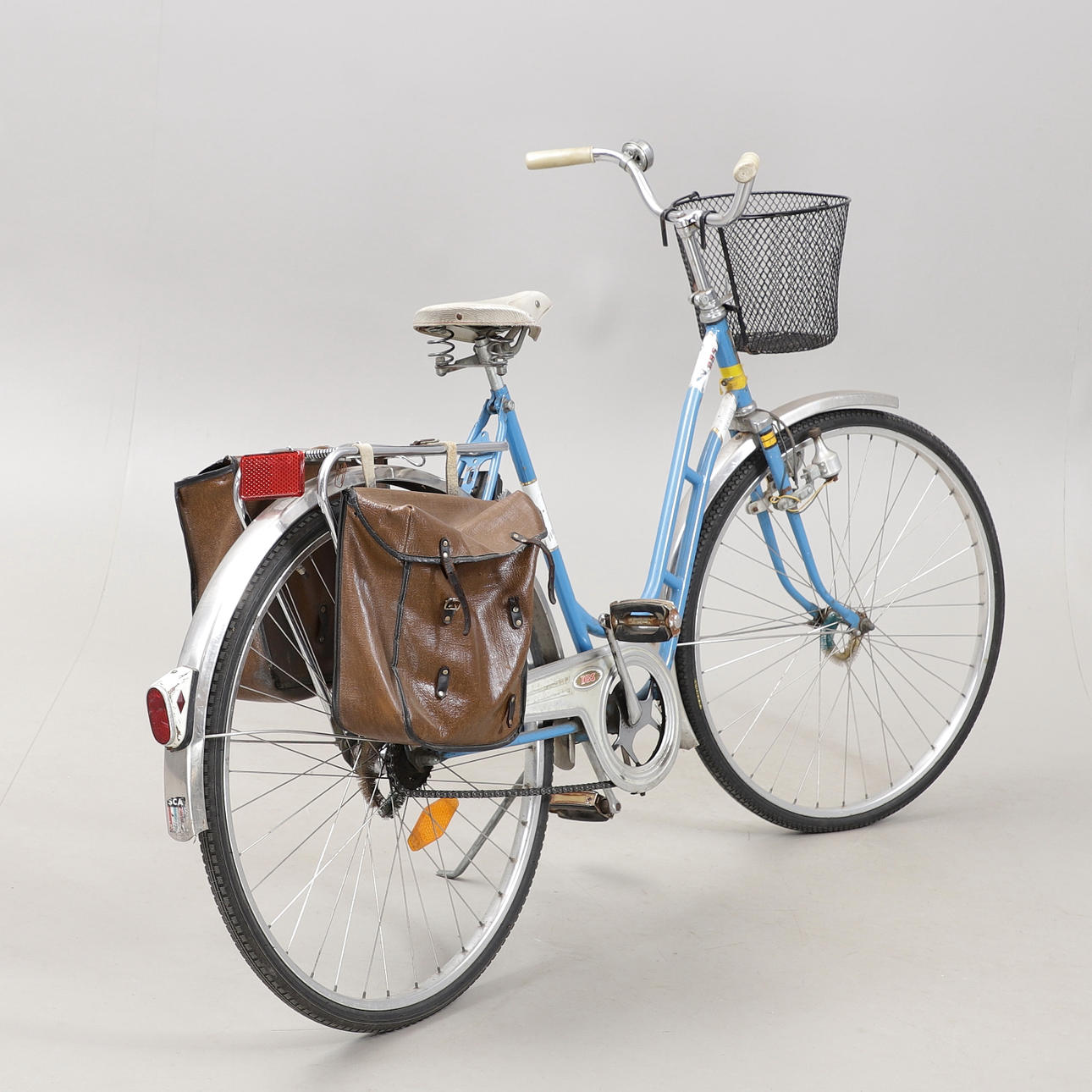 Med cykelkurv og cykeltasker.