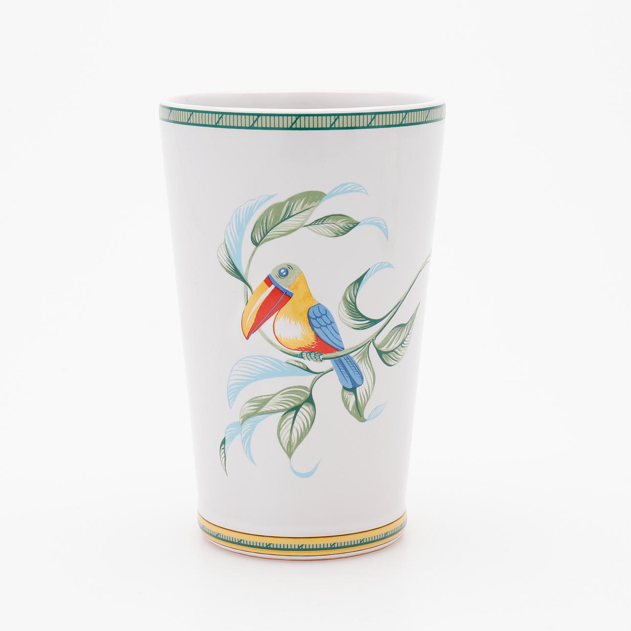 Fajance med dekor i relief forestillende tukaner med maleri i farver, vasehøjde 12,5 cm, skåldiameter 15 cm, med æske.