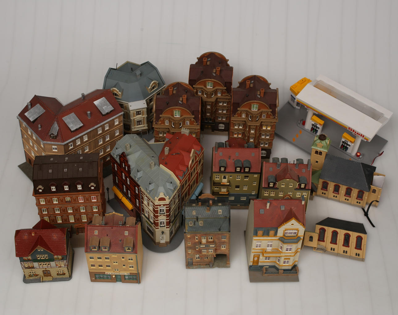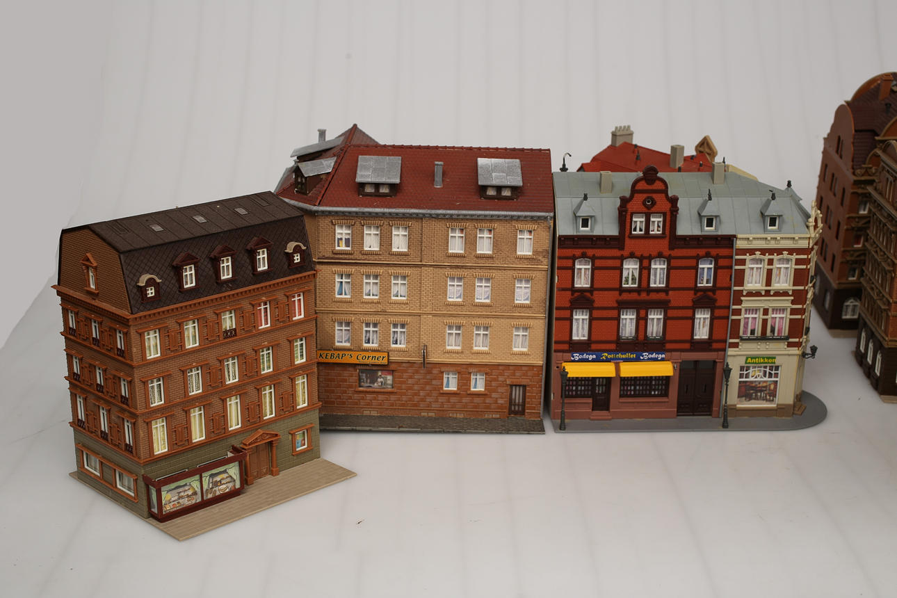 3048777. MODEL JERNBANEHUS, plast, diverse epoker, 15 stk.