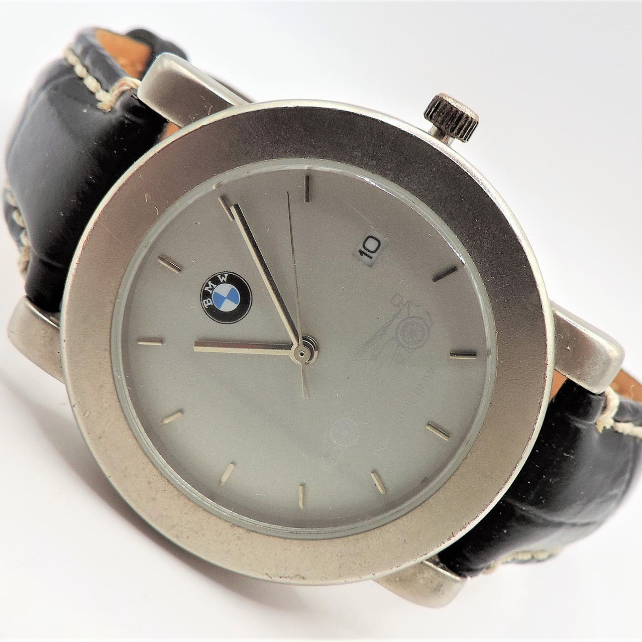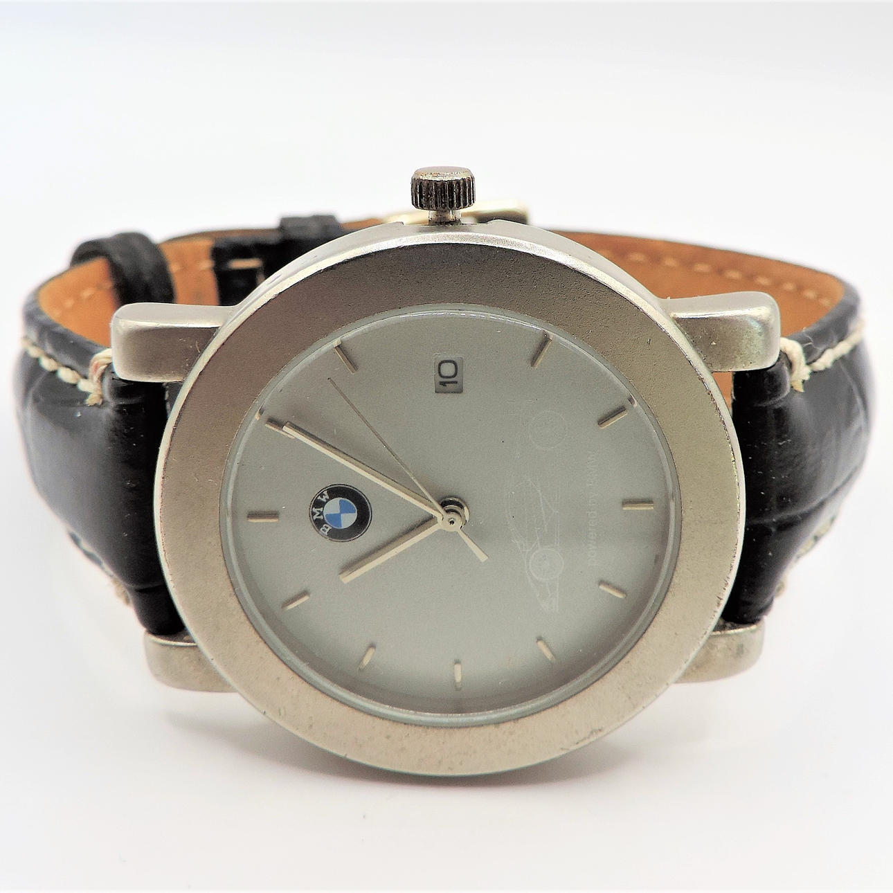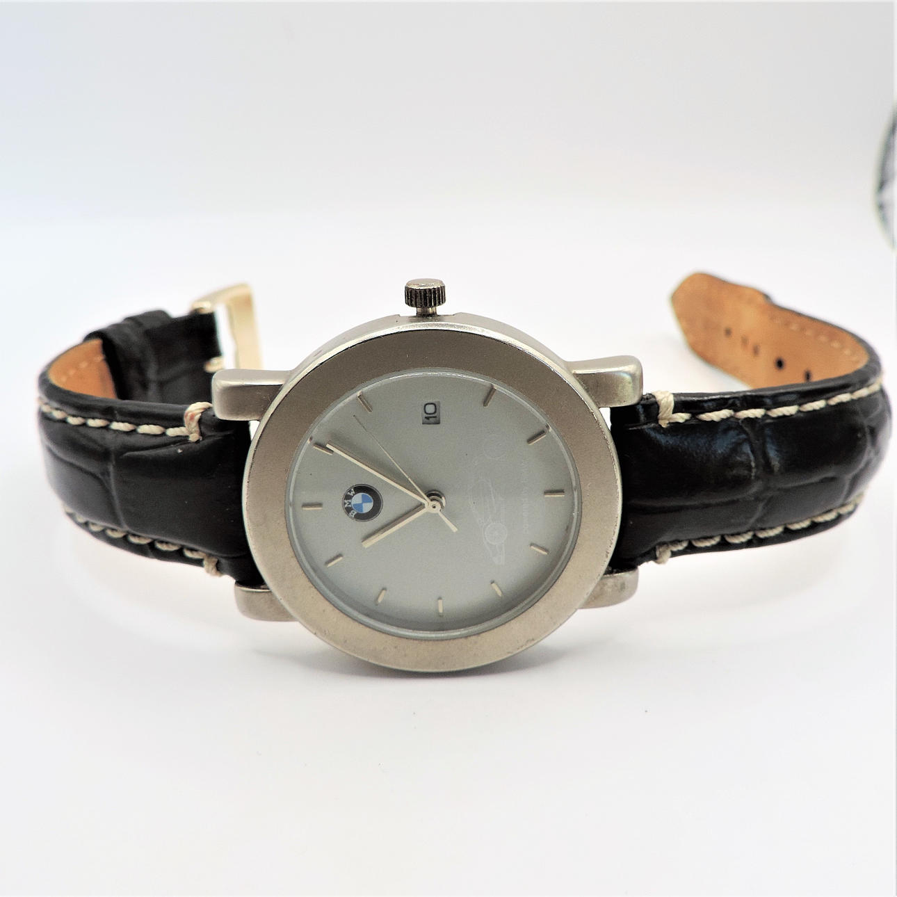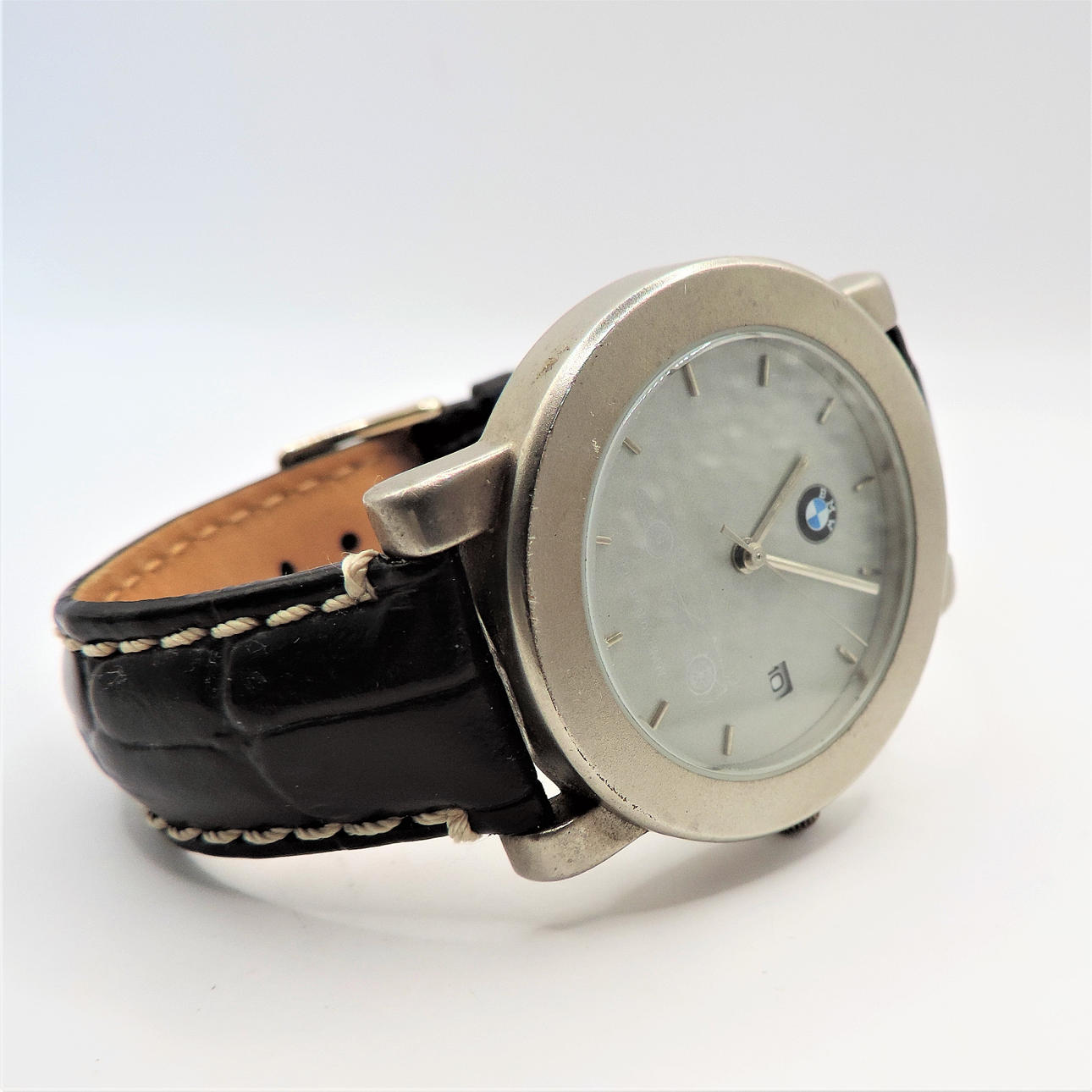 Et BMW armbåndsur med sort super krokodille læderrem. Urskiven er rund med en diameter på 38 mm, og remmen er 20 cm (8 tommer) lang. Stand: Rigtig god og fungerende .