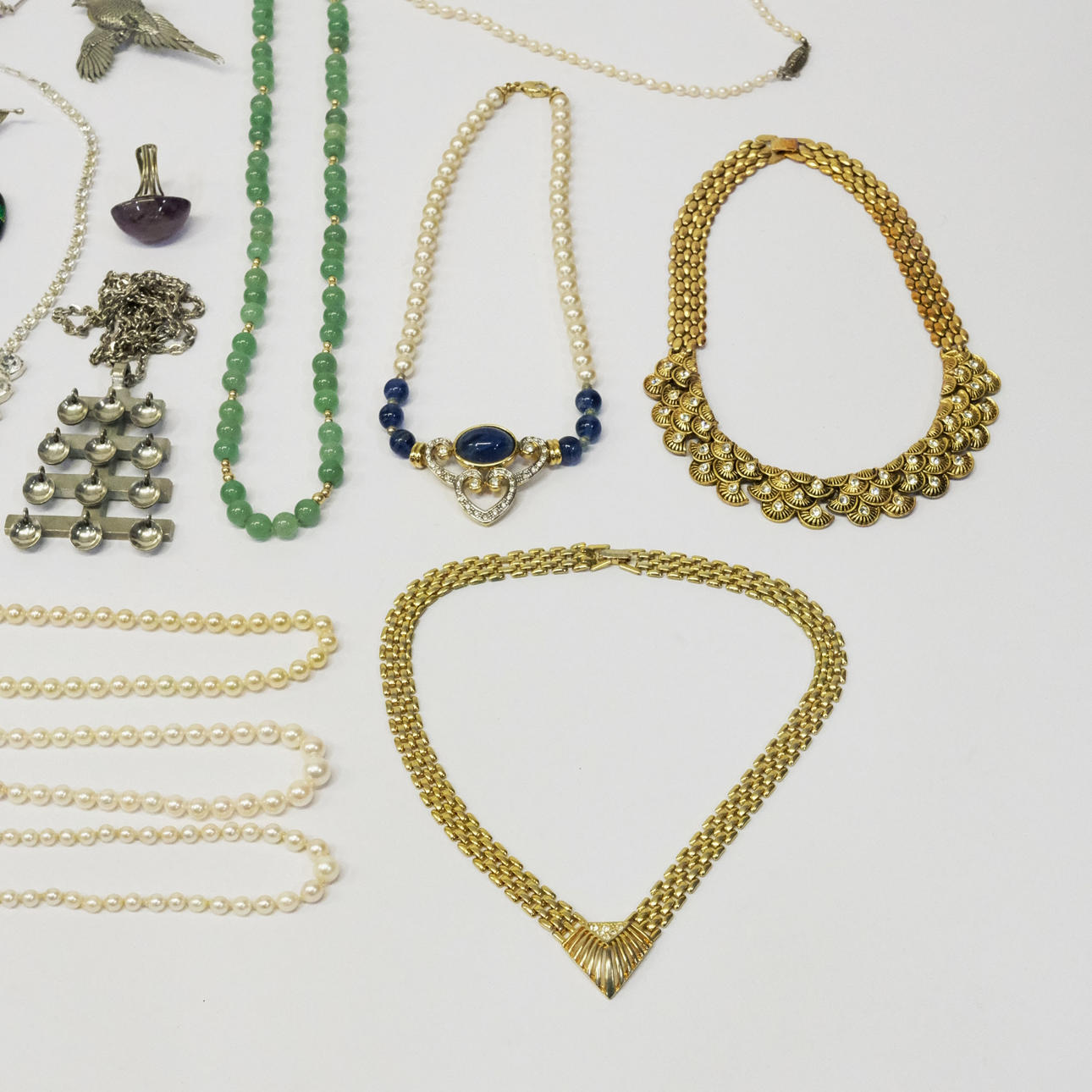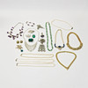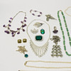 Smykker, herunder rhinestone halskæder, halskæder med grønne sten, brocher mv.