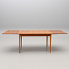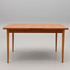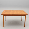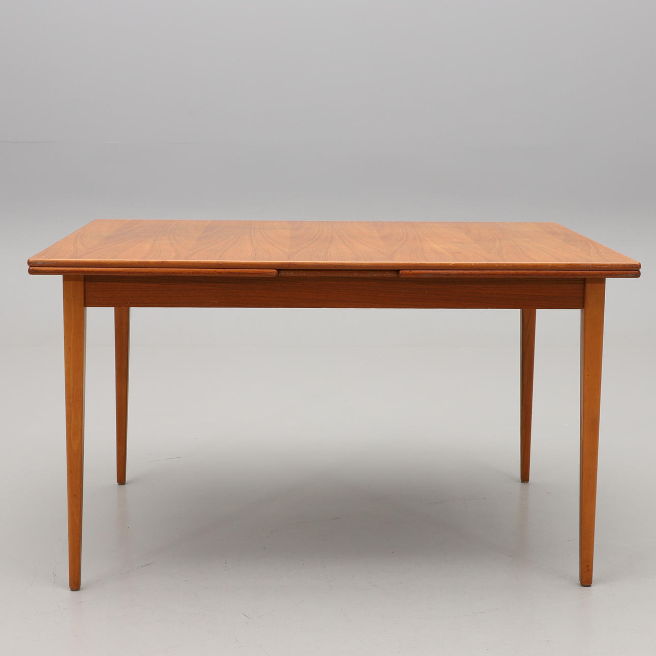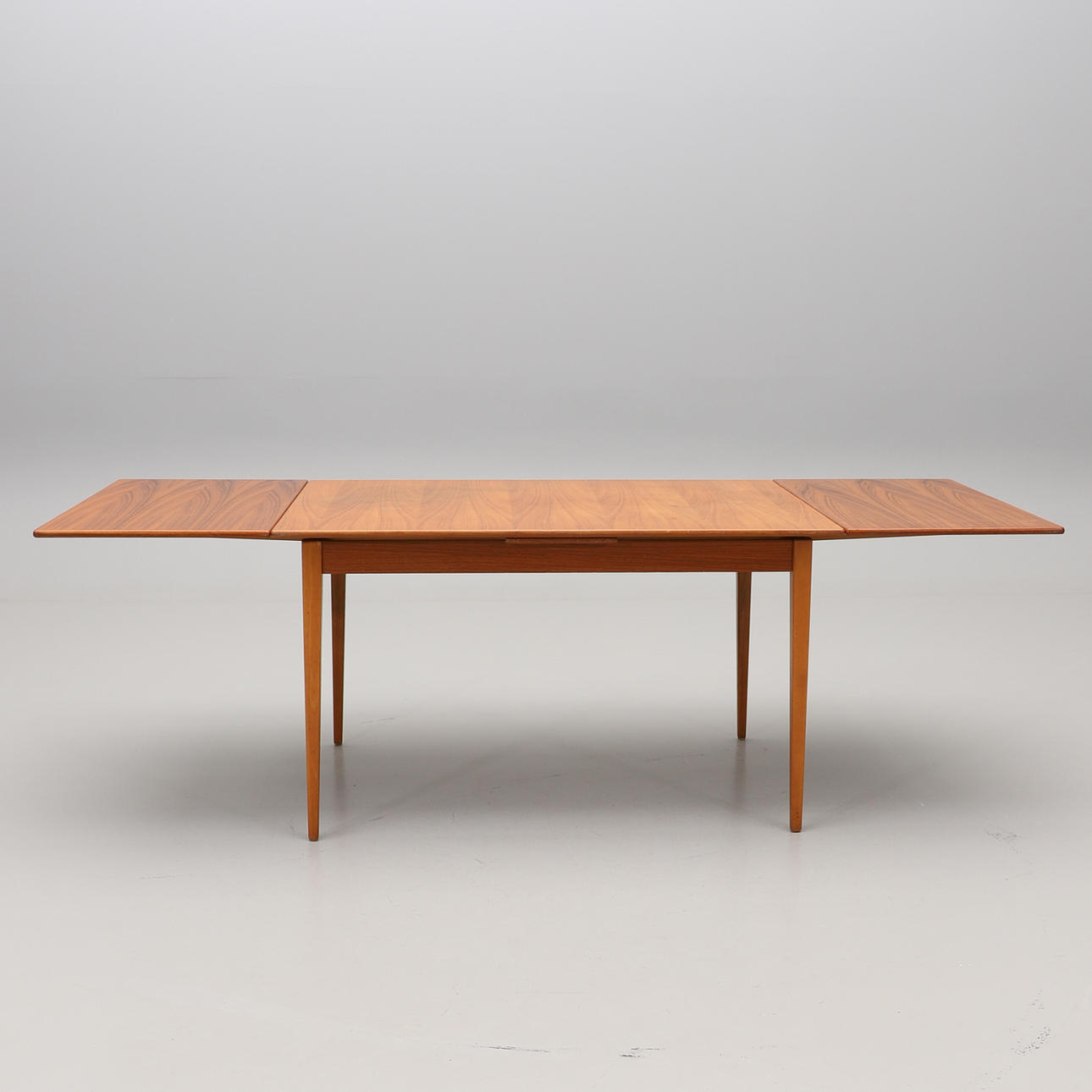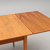 Top i teak, ben i bøg. 2 udtræksskiver á 52 cm.