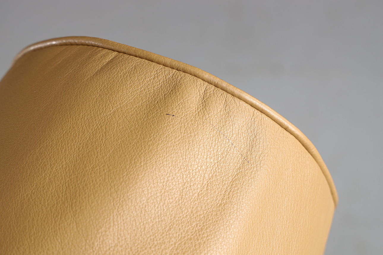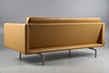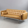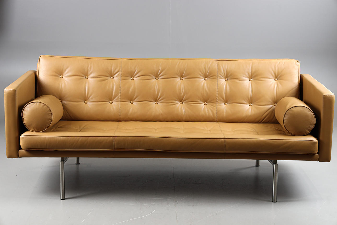Betrukket med naturlæder, løse hynder i sæde, ryg og to puder, ben i rustfrit stål, mærket med etiket, sædehøjde ca 42, længde 210, højde 85 cm.