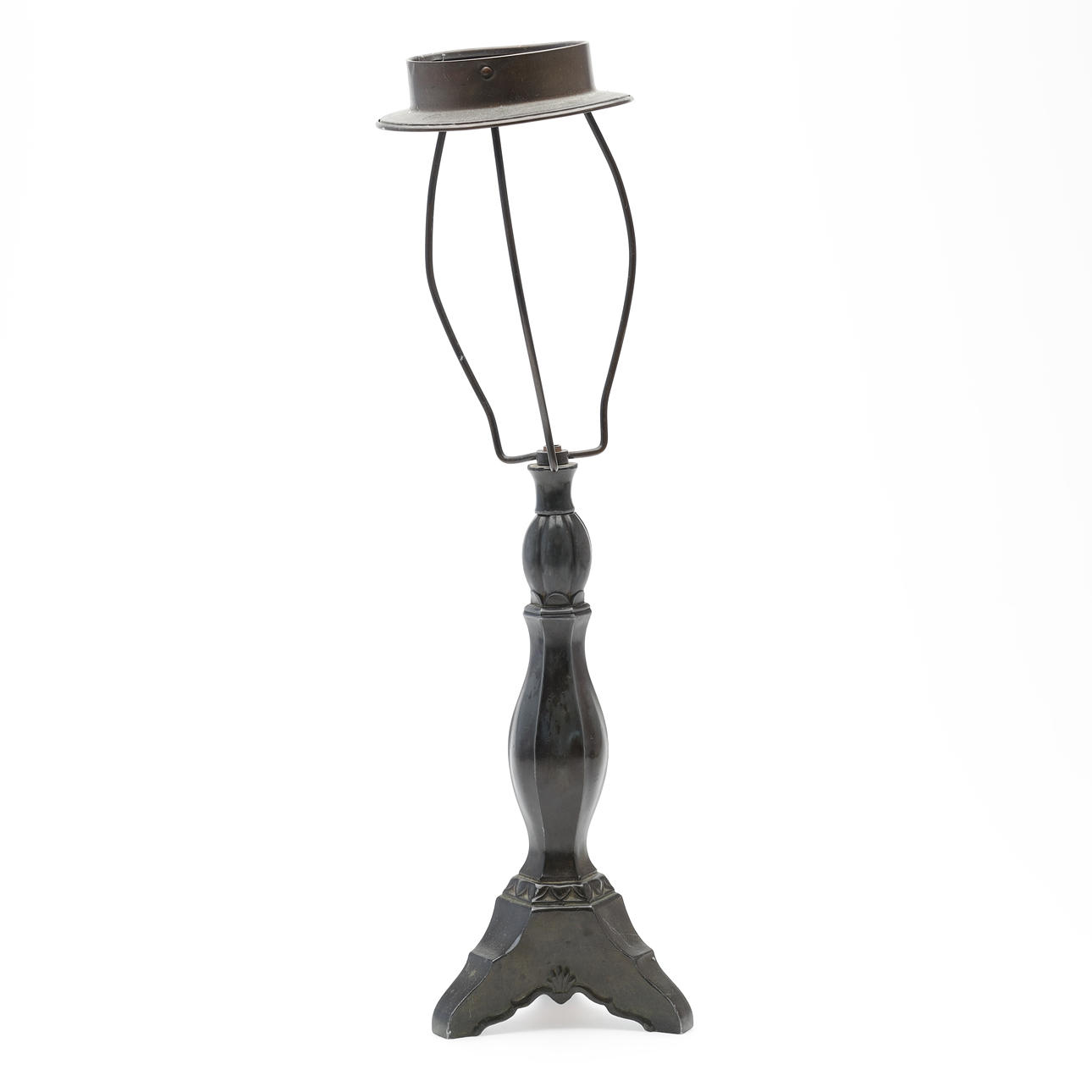 Trefodet bordlampe udført af Just Andersen, discometal. Under foden mærket: "DANSK", "ARBEIDE", Just stempel i trekant samt nummereret 01.