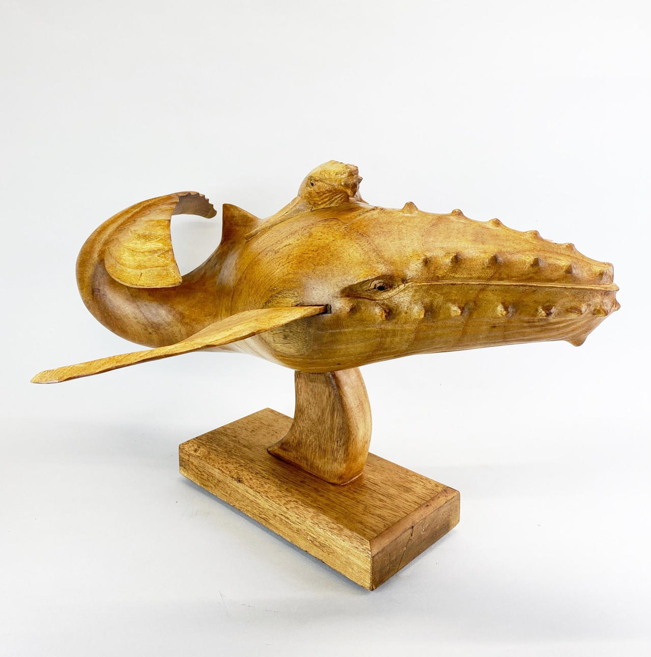 En stor udskåret træmodel af hval og kalv, L. 64cm. H. 40 cm.