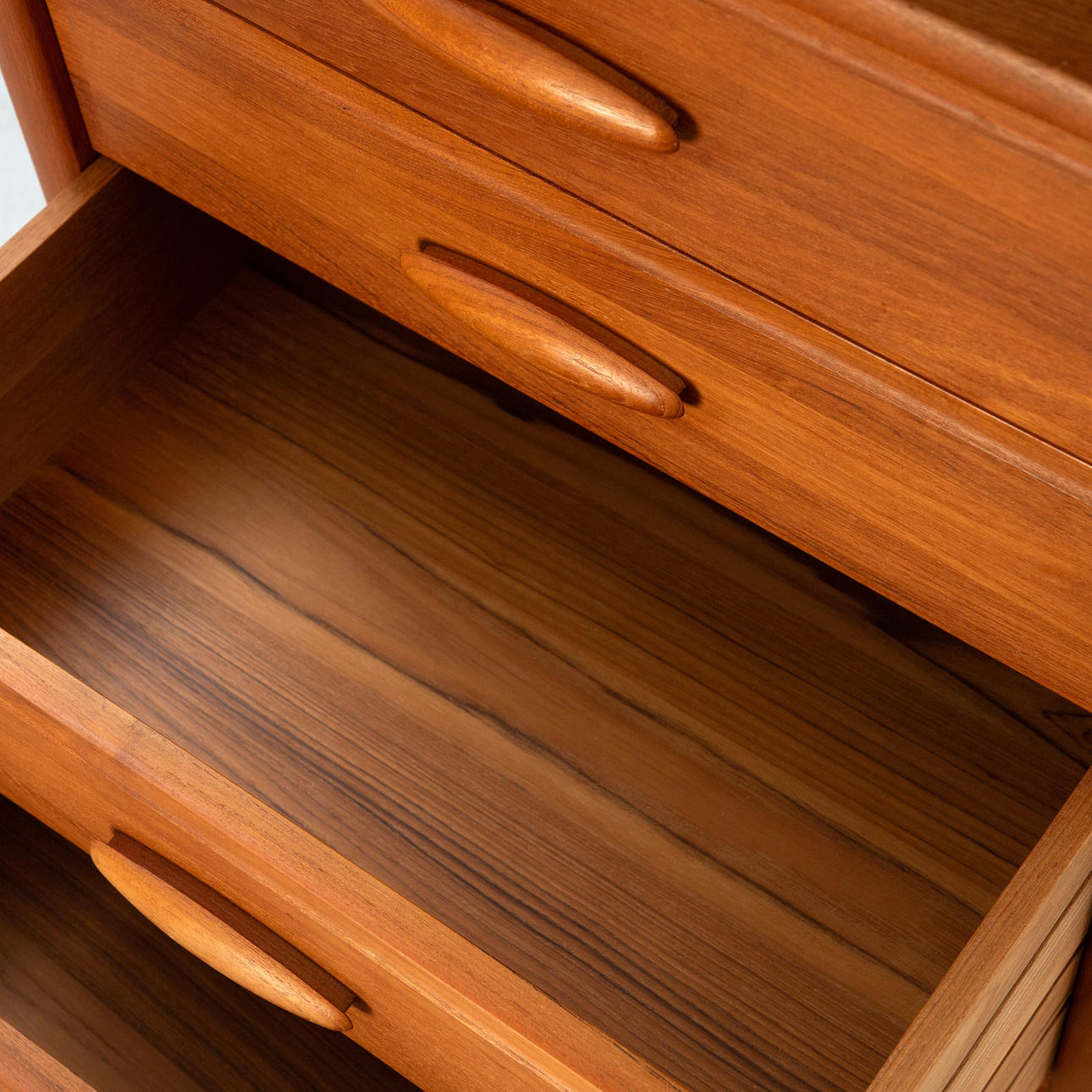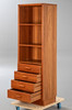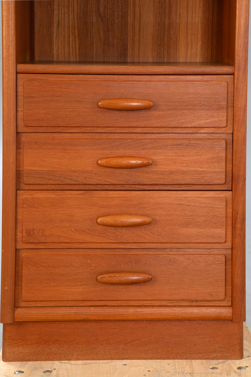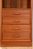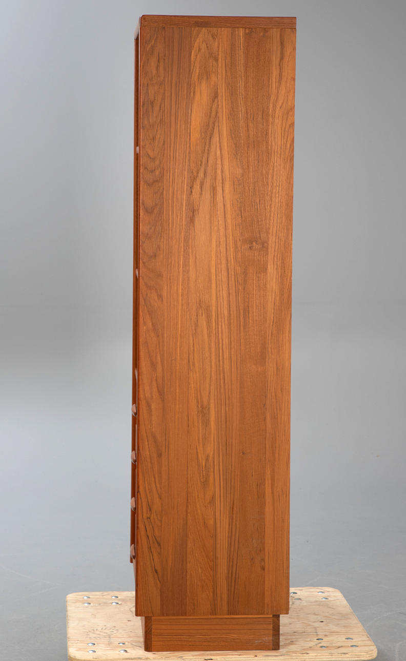 Dansk design. Teaktræ, delvis fineret. 4 skuffer, 2 hylder. Mærket med etiket. HxBxD: ca. 163x54x40 cm.