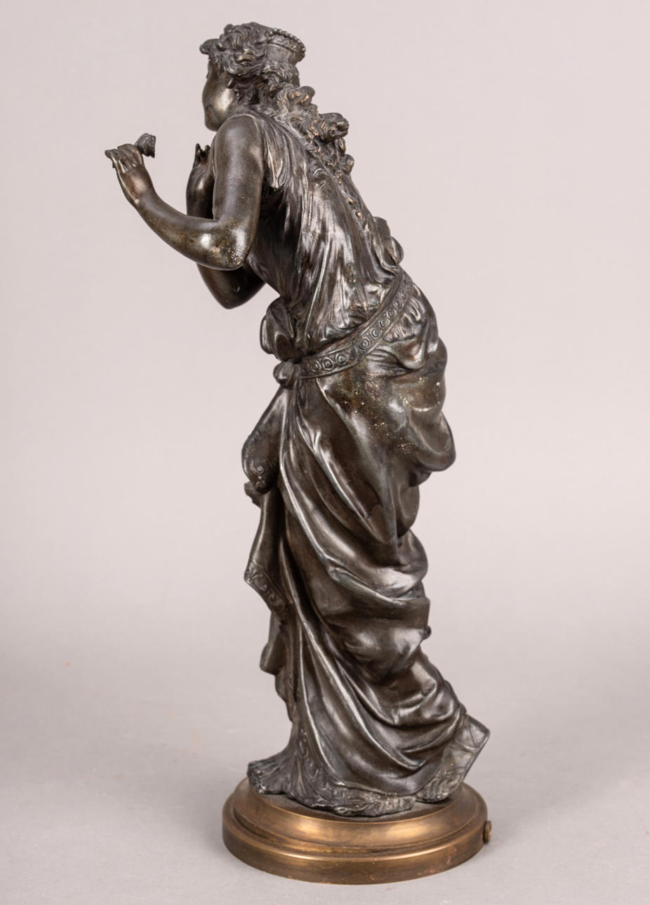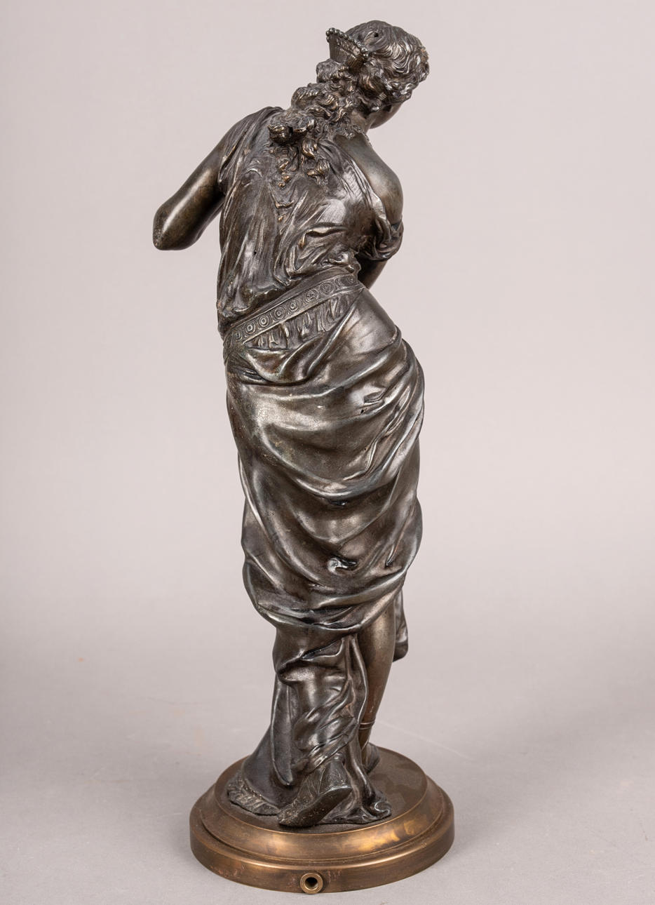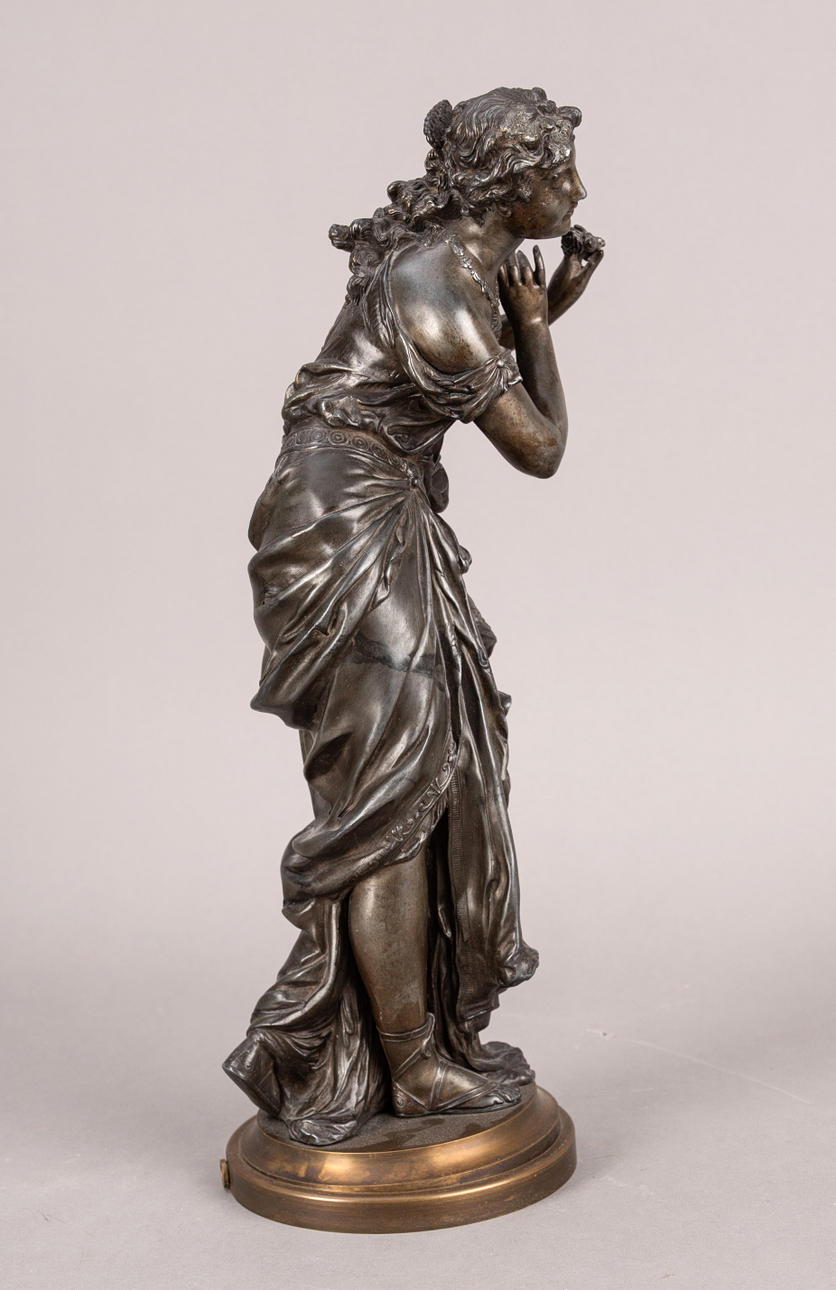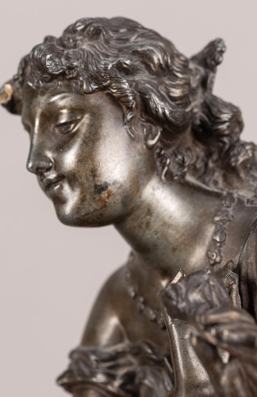 Støbt zink, mørkebrun patina./Messing. På en rund base med en profileret kant, den unge kvinde, klædt i antik stil, hendes bølgede hår tæmmet med en rigt dekoreret kam. H: 45,5 cm.