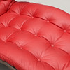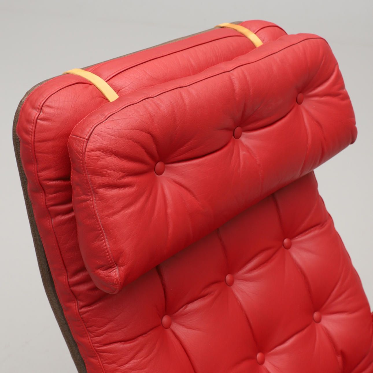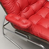 Stel af forkromet stålrør, nederste sæde i brunt syntetisk stof. Fyldt pude, nakkepude og armlæn betrukket med bordeaux knapsyet læder. Længde ca 145 cm.