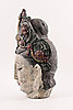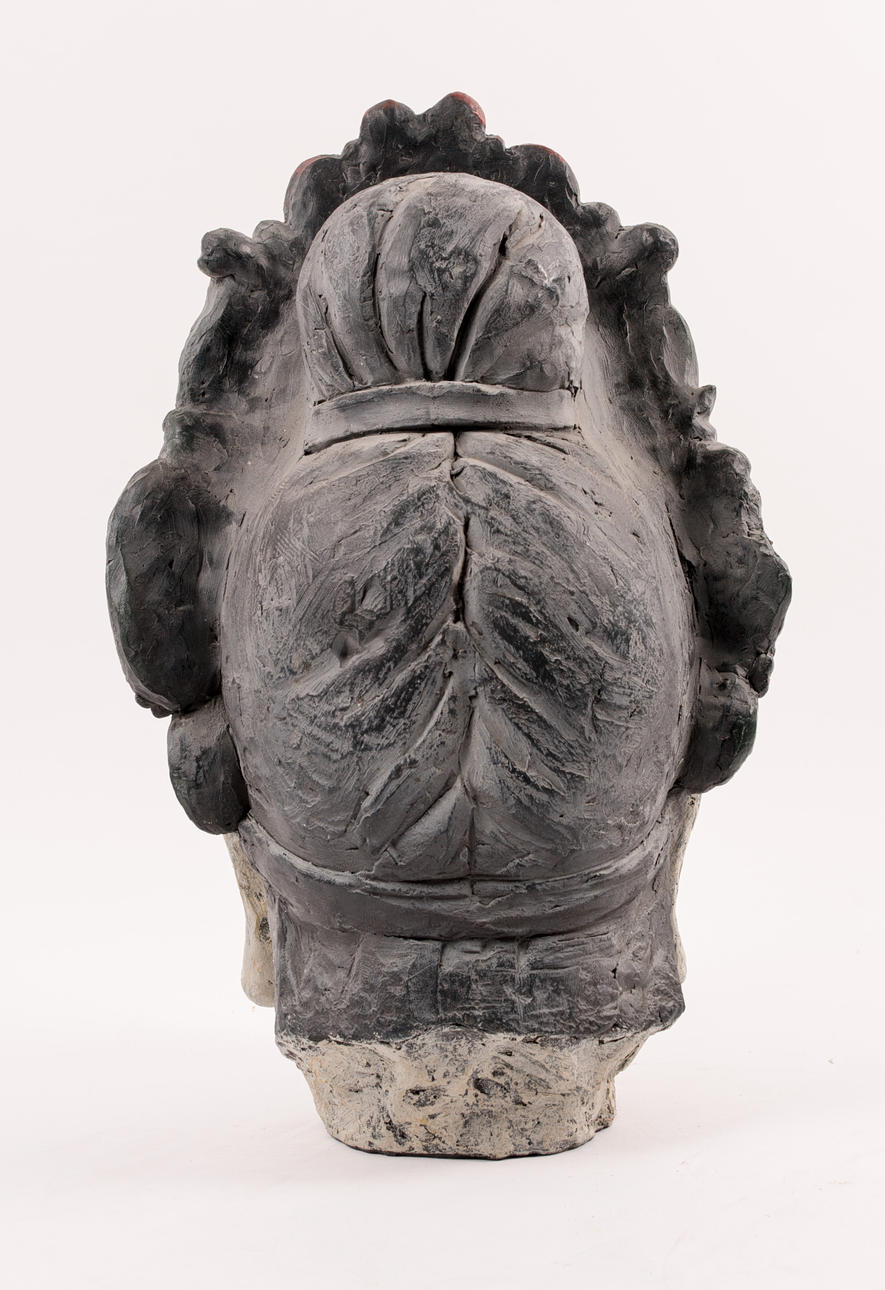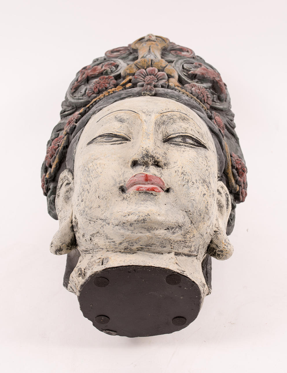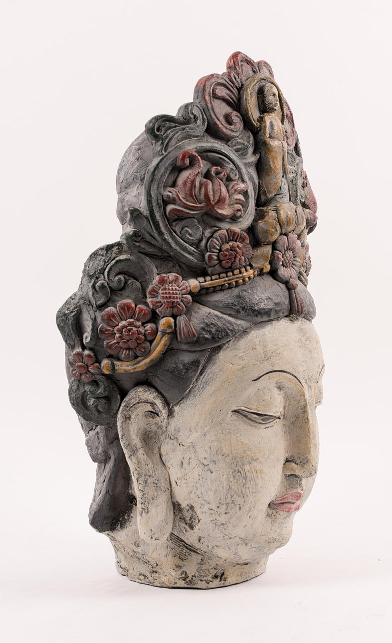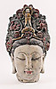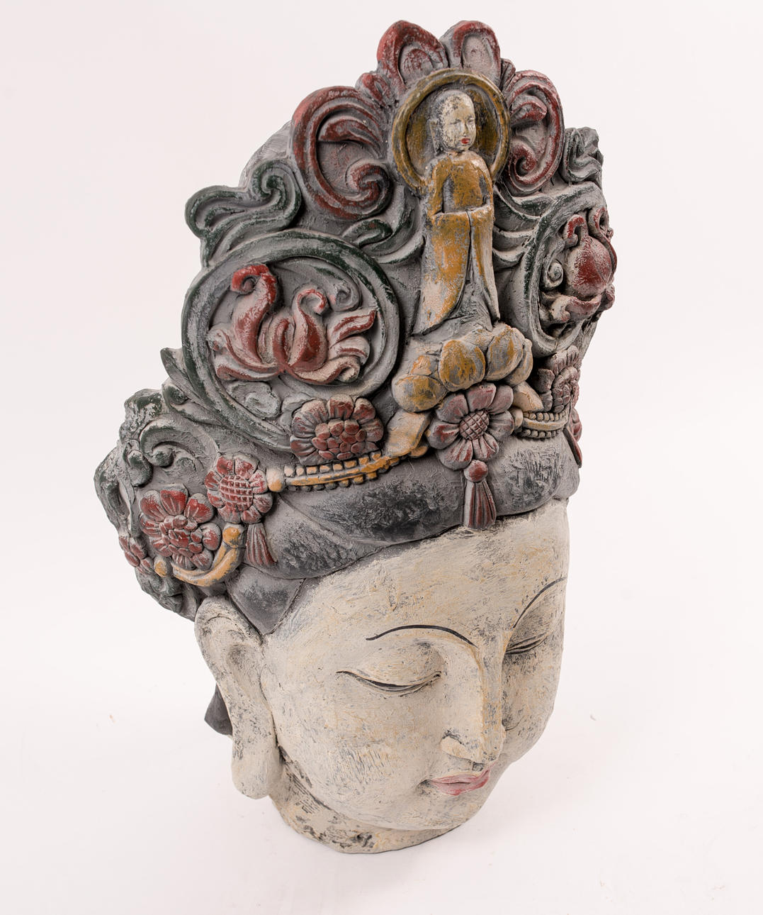 Blomstergudinde (hoved) med rigt dekoreret blomstret hovedbeklædning, lavet af papirmache og gips, arbejdet i buddhistisk stil.