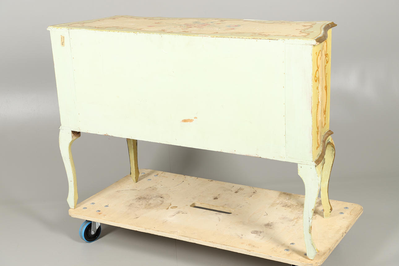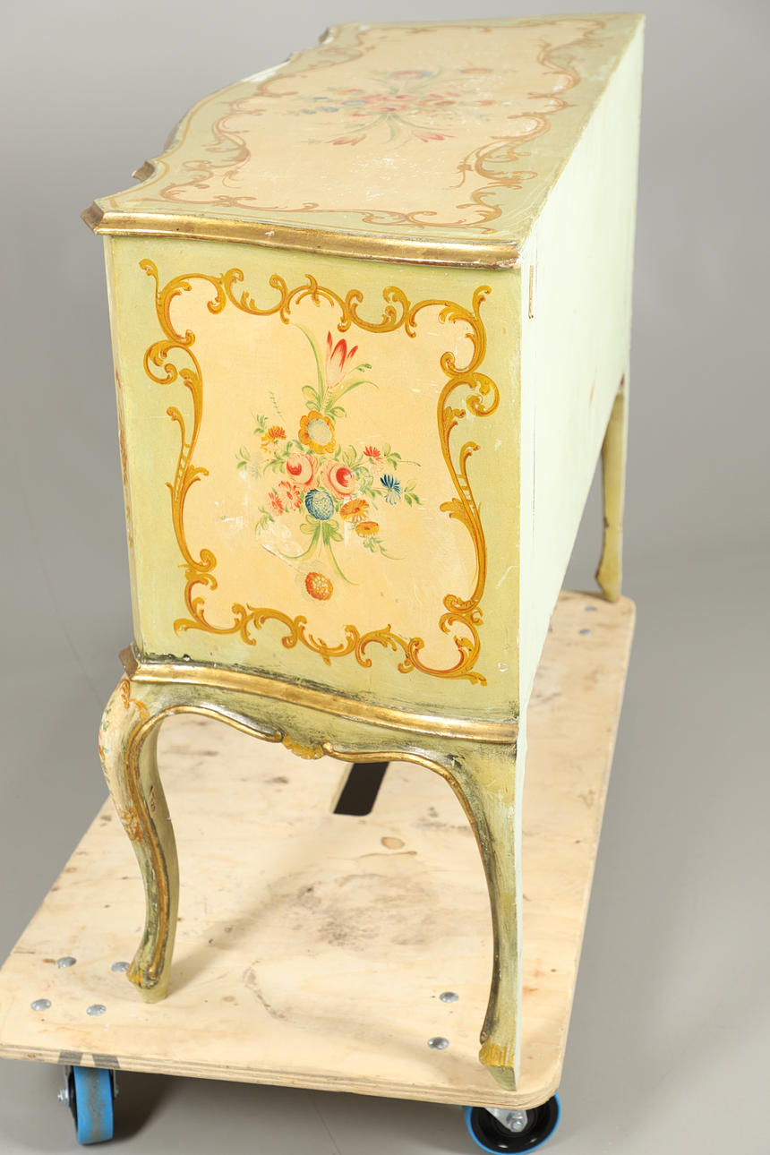 Af trækonstruktion og malet med blomsterdekoration. Serpentine front, på cabriole ben og skuffer med metal greb. Højde 83cm x Længde 121cm x Dybde 45cm.