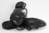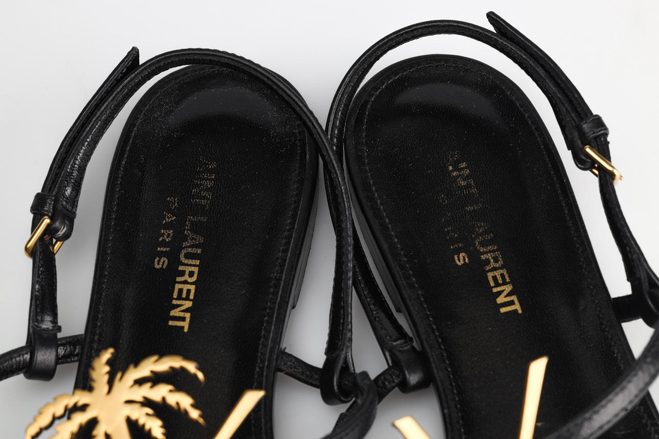 Remsandal i sort læder med YSL-logo i messingfarvet metal. Indvendige mål ca 25 cm.
