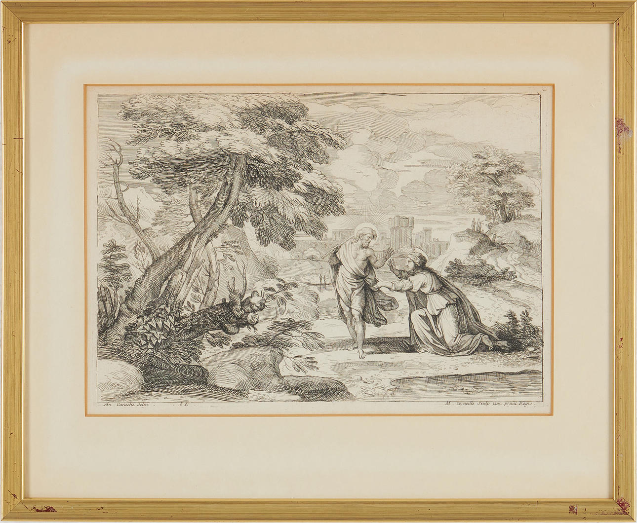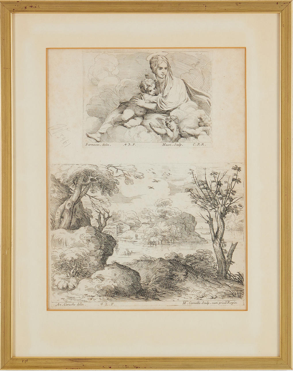 efter Annibale Carracci, M Corneille skulptur. religiøst motiv, billedareal 28 x 40 cm, efter Annibale Carracci, Massé sculp., 28,5 x 40 cm, efter Annibale Carracci, M Corneille skulptur. landskab efter Parmesan, Massé, Madonna og barn billedareal 41 x 31 cm, Wernerin, efter, Lindemann sculp., Leda et l'amour og Venus et l'amour, billedareal 40 x 25,5 cm, kobberstik (4).
