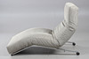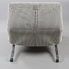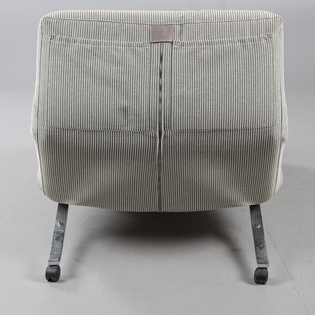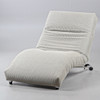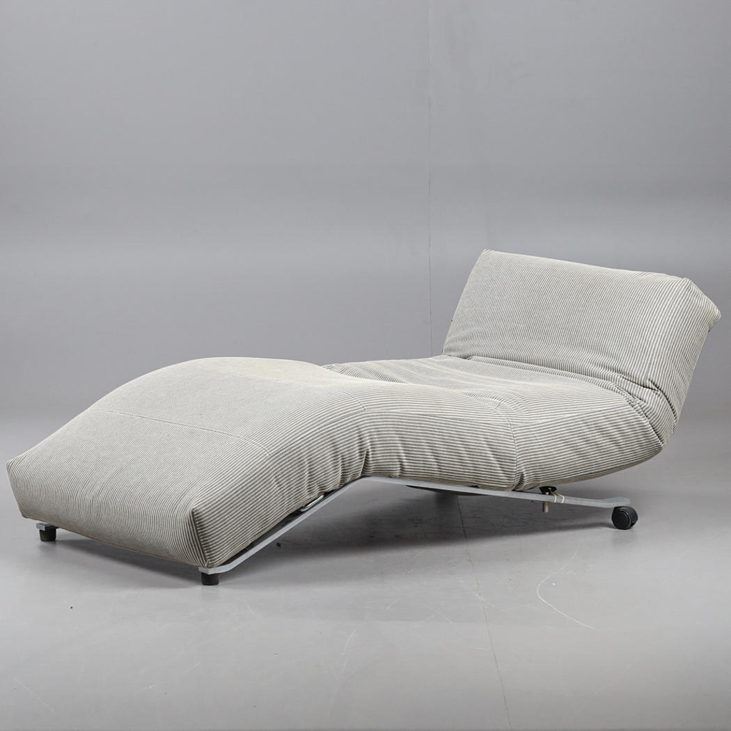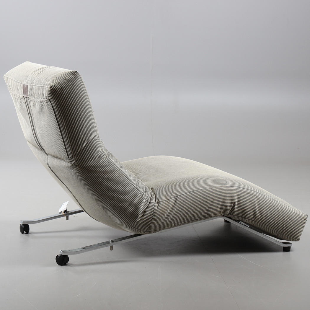 benstøtte i forkromet stål, tekstilbetræk, to ben på hjul, justerbar ryg, aktuel længde ca 160, bredde 80 cm, sædehøjde 35 cm.