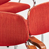 Stof i stålrør og armlæn i teak. Fast polstret ryg og sæde betrukket med stof.