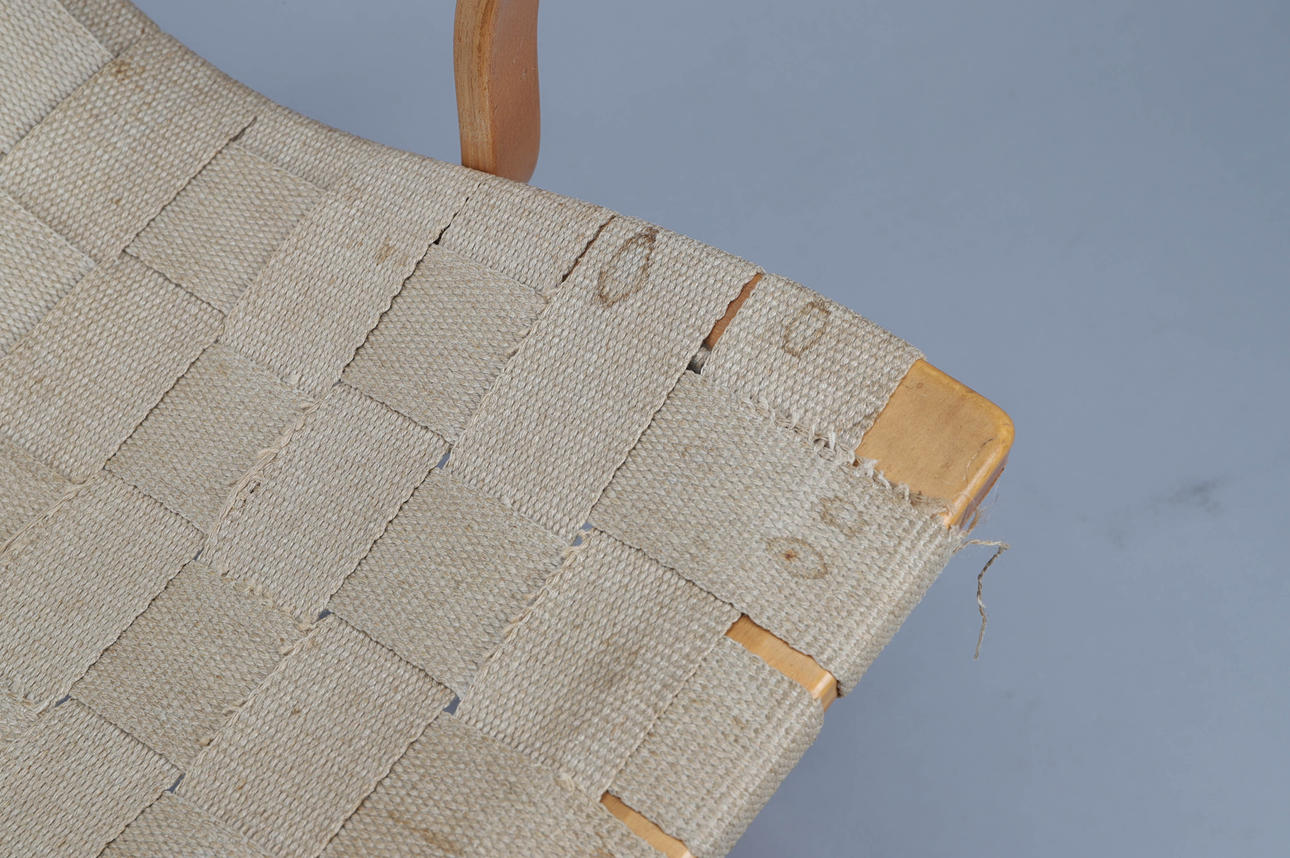 Bog, beklædt med flettet sadelgjord, mærket, model designet 1941, sædehøjde ca 39 cm.
