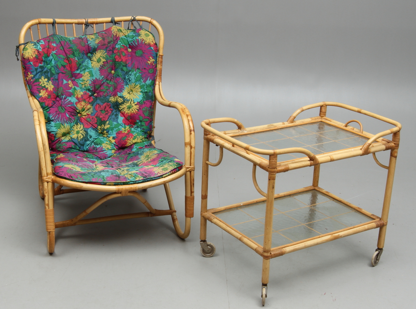 31037. LÆNESTOL, SERVERINGSVOGN, rattan, 20. århundrede.