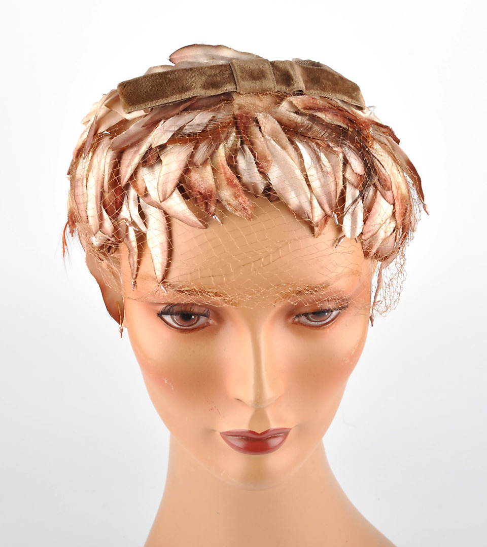 310938. KOPFBEDECKUNG 86. pandebånd. Tekstil, stiliserede fjer, meshkant.
