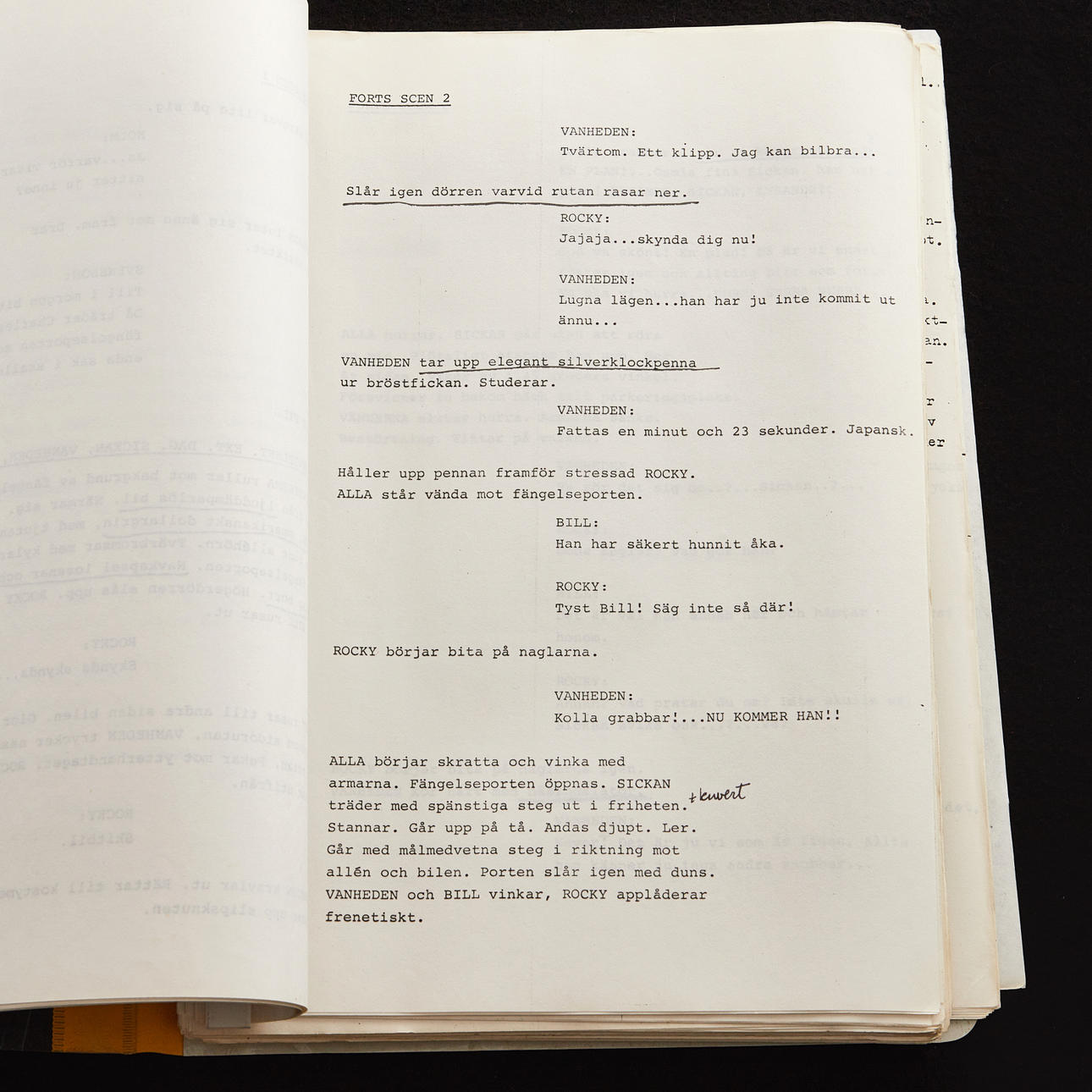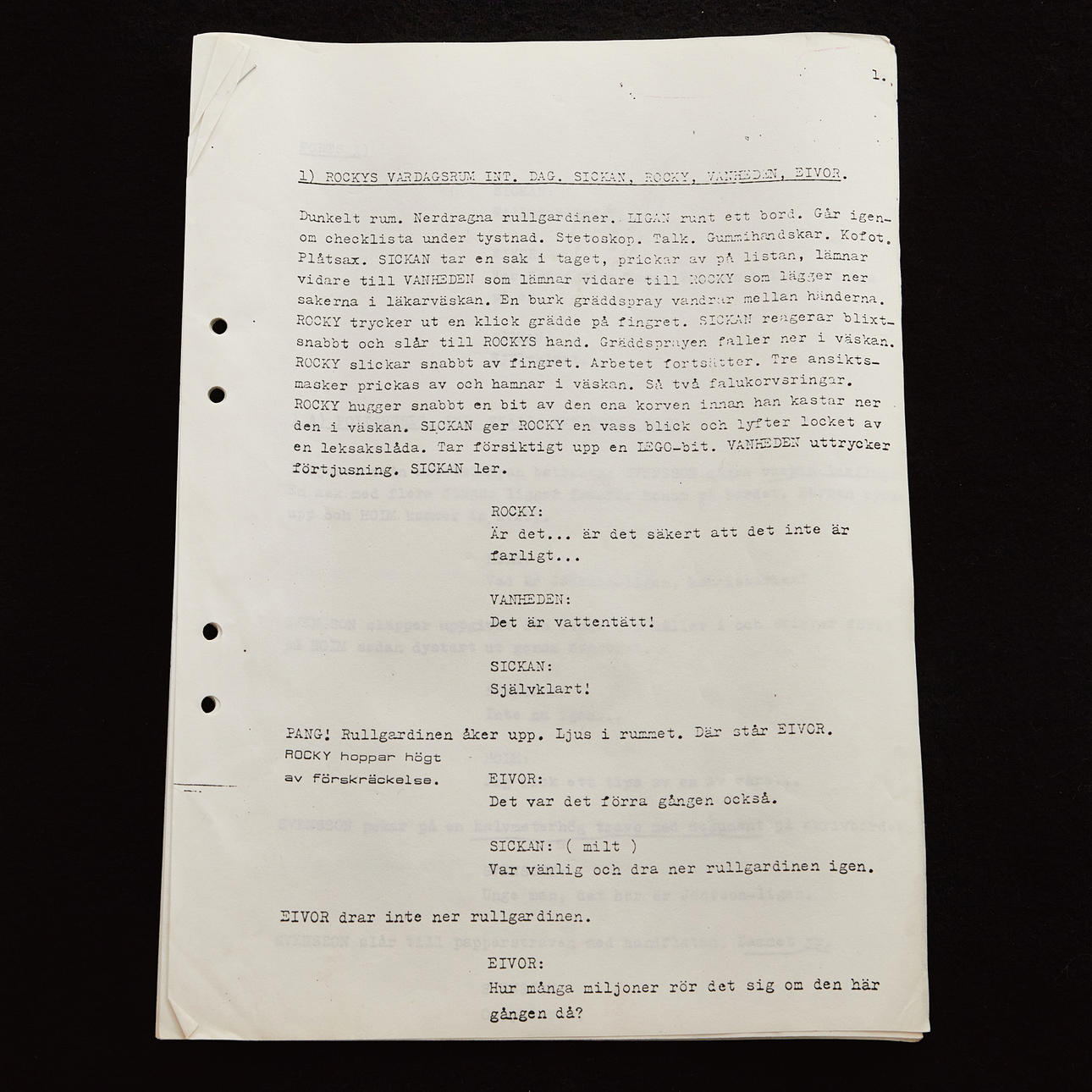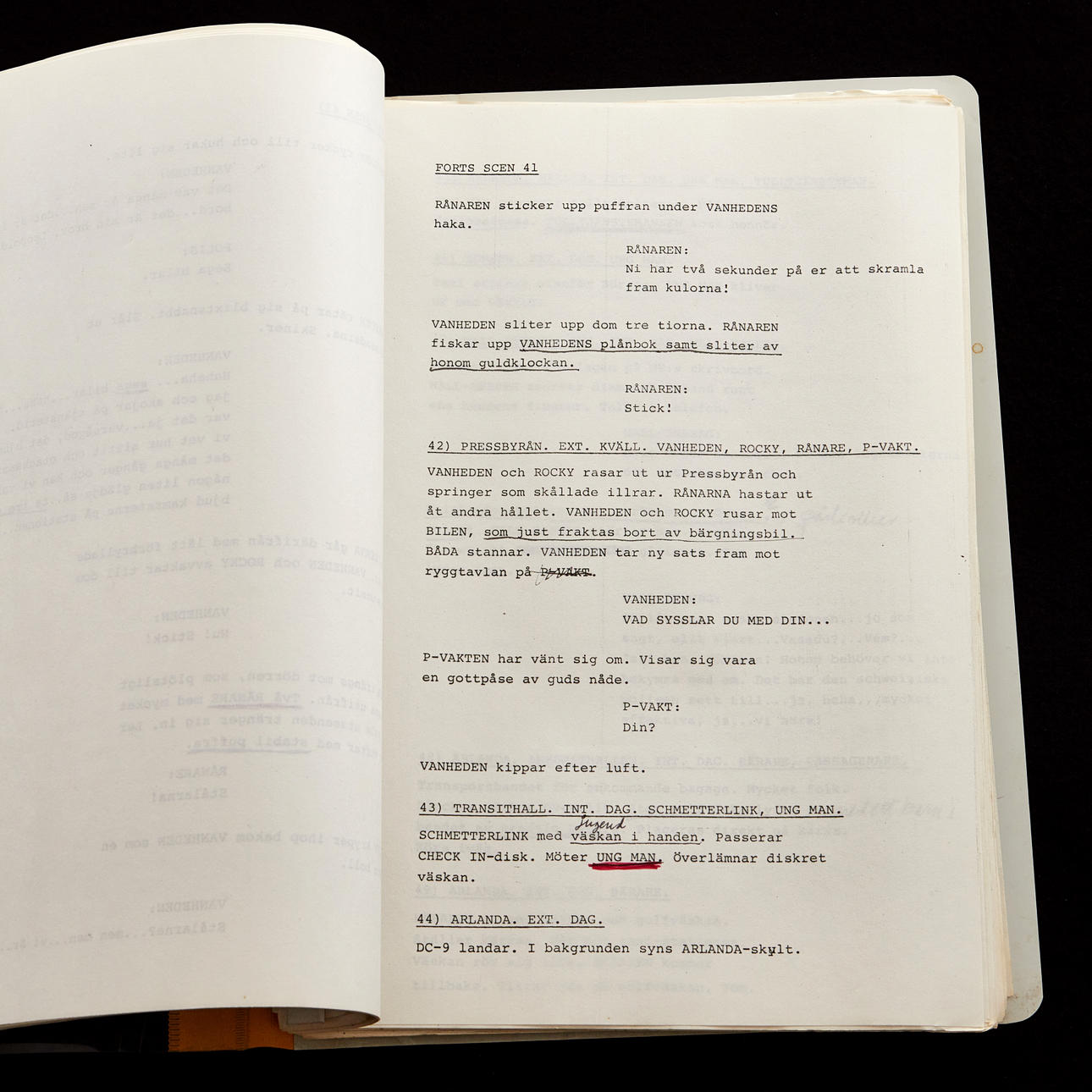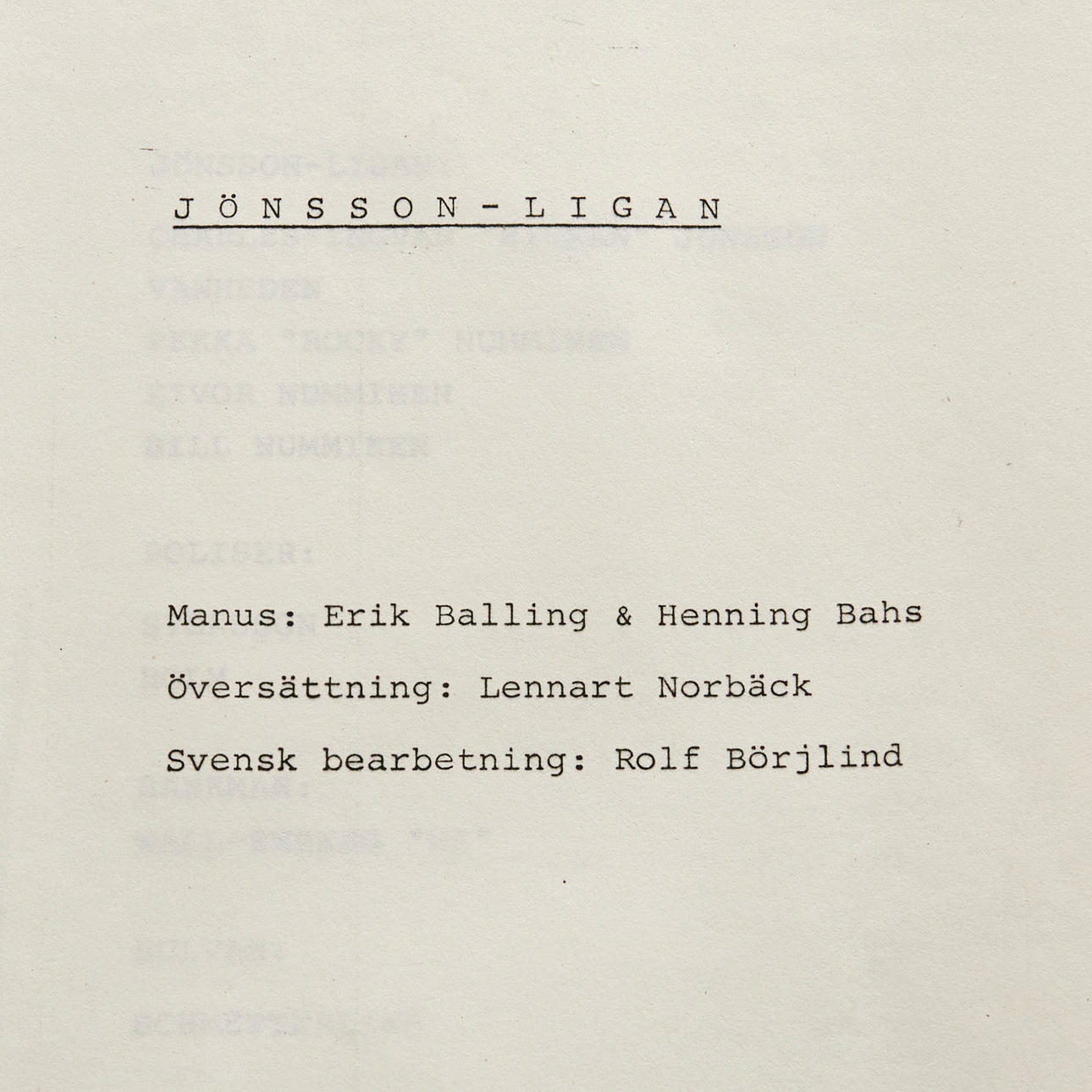 Originalmanuskript fra optagelsen af JÖNSSON-LIGAN (Advarsel for Jönssonligan) fra 1981. I plastfolie og 10 løse sider, der hæftes sammen. Enkelte håndskrevne overlinjer. Scriptet kopieres dog fra en kopi med mange håndskrevne noter og overlines og mere.